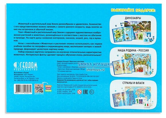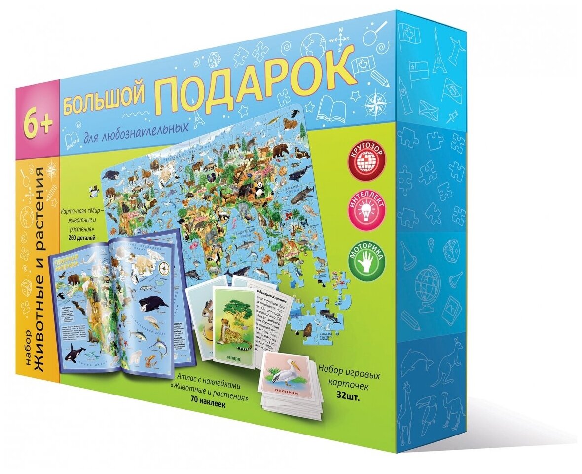| Комплектация | 1 карта-пазл Животный и растительный мир Земли формат 33*47 см, 260 деталей, 1 атлас мира Животные и растения 21*29, 7 см, 70 наклеек, 1 подарочная коробка |