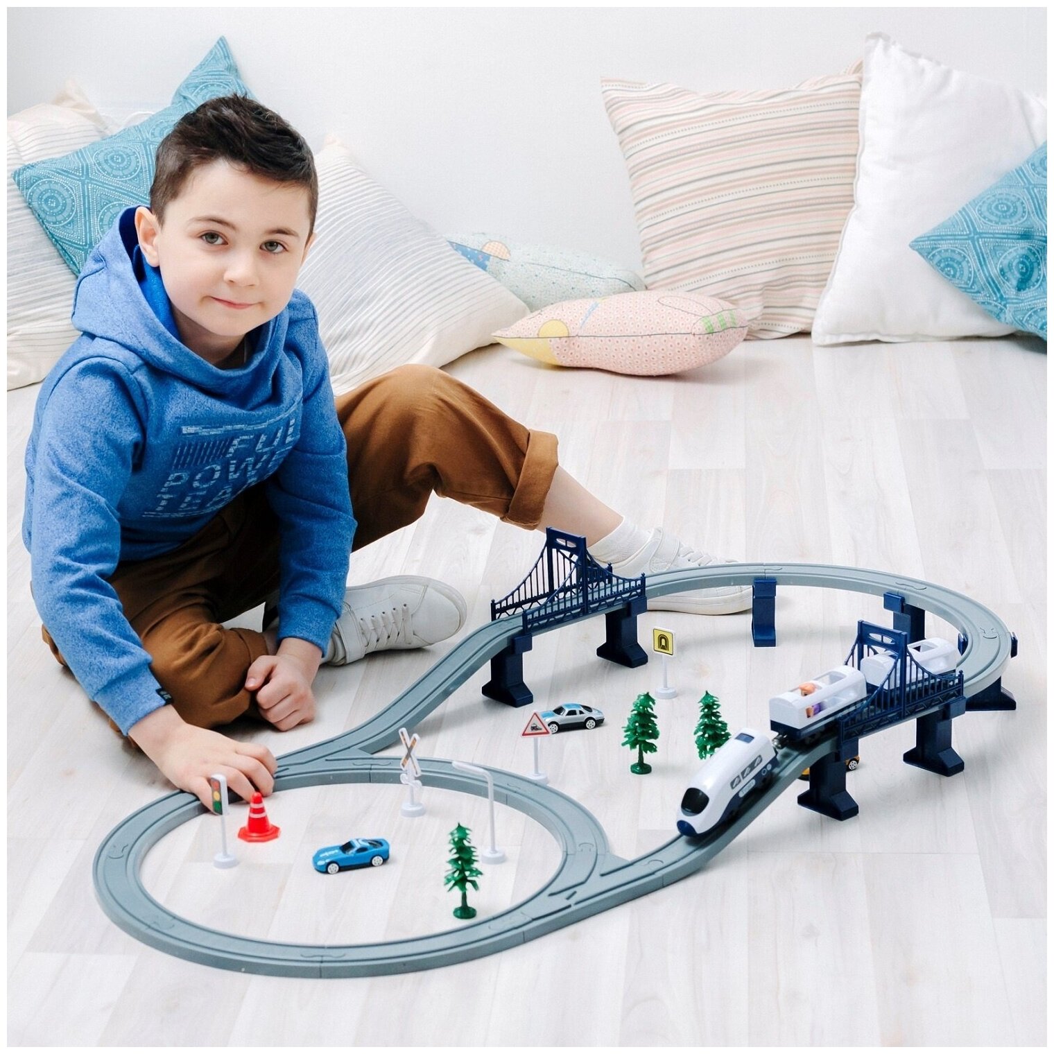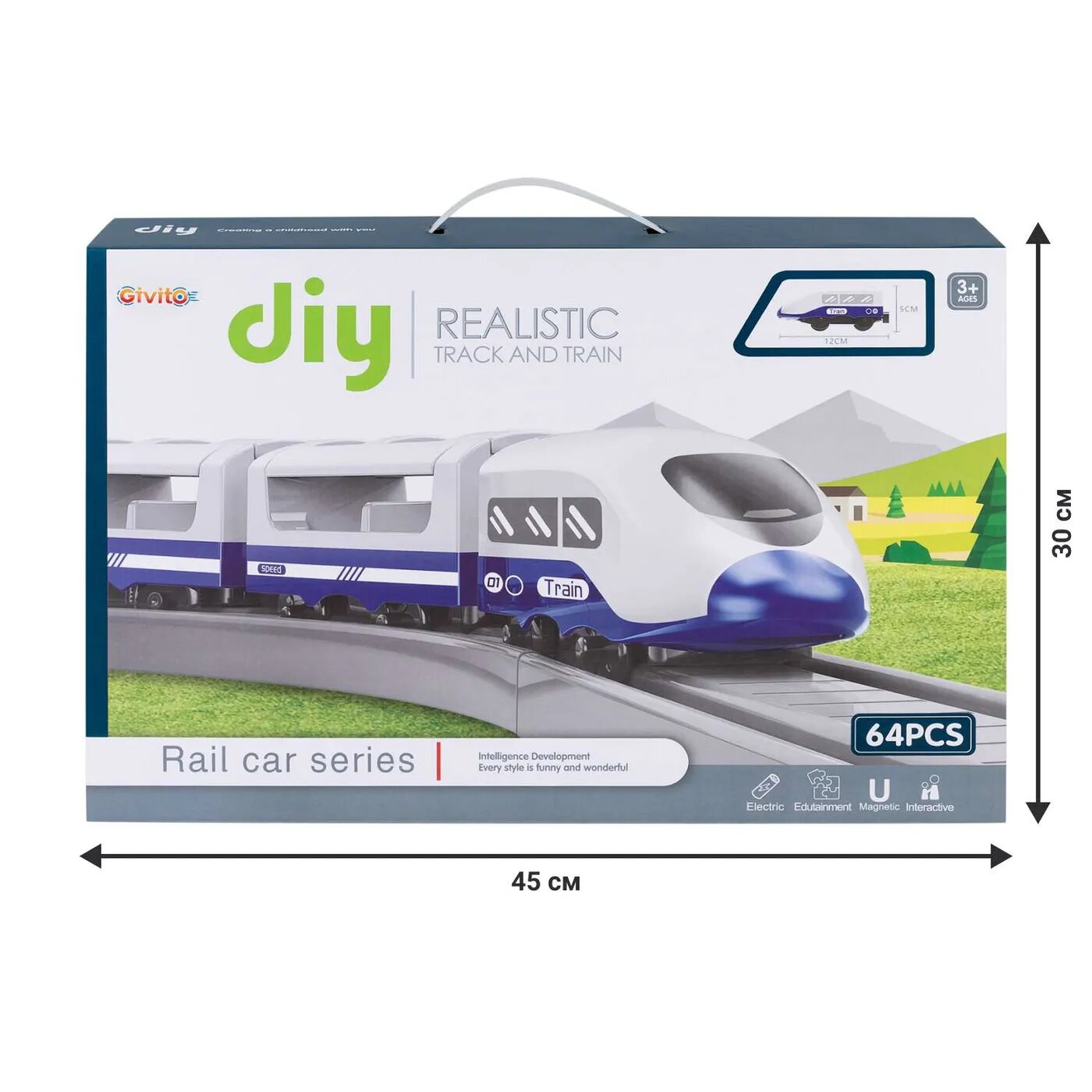 • Интерактивная железная дорога из 64 предмета рекомендуется для мальчиков и девочек от 3 лет.• Локомотив работает от батареек AAA.• При нажатии на кнопку, локомотив самостоятельно поедет по рельсам.• Локомотив имеет яркий современный дизайн. • Вагоны поезда соединяются между собой с помощью надежных магнитов.• Игрушка изготовлена из прочного и безопасного пластика, устойчивого к механическому воздействию.• Игра с набором способствует развитию навыков в сюжетно-ролевой игре, стимулирует зрительно-моторную координацию.• Идеальная игрушка для маленьких любителей поездов.• Большой набор идеально подойдет для нескольких детей.• Комплектация: локомотив, два вагона, железная дорога, два моста, четыре машинки, дорожные знаки - 6шт, деревья – 3 шт. и фигурка жителя.• Все элементы комплекта совместимы с другими сборными моделями железной дороги «Givito». • Юный машинист сможет прокладывать различные маршруты, строить новые станции и придумывать уникальный ландшафт.• Железная дорога - отличный подарок на День рождения, Новый год и любой другой праздник.
