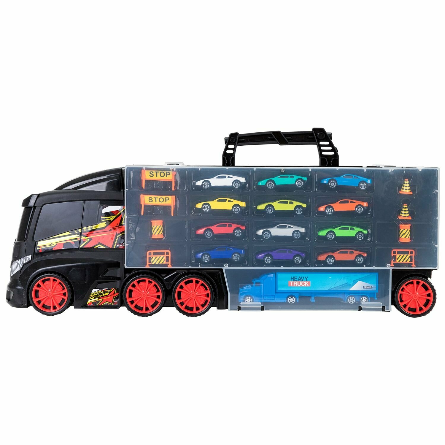 Givito "Мой город" (Автовоз - кейс 60 см черный. Набор из 12 машинок 1 фуры и 8 дорожных знаков)