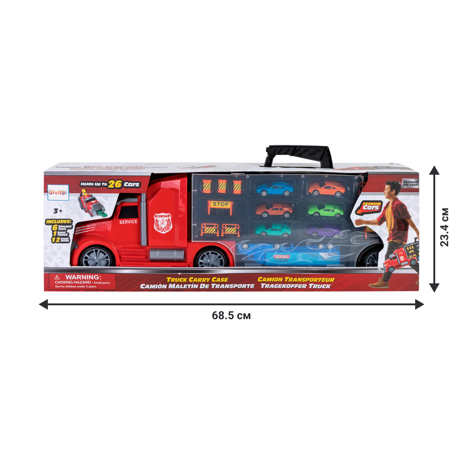 Givito "Мой город" (Автовоз - кейс 64 см красный с тоннелем. Набор из 6 машинок 1 фуры и 12 дорожных знаков)