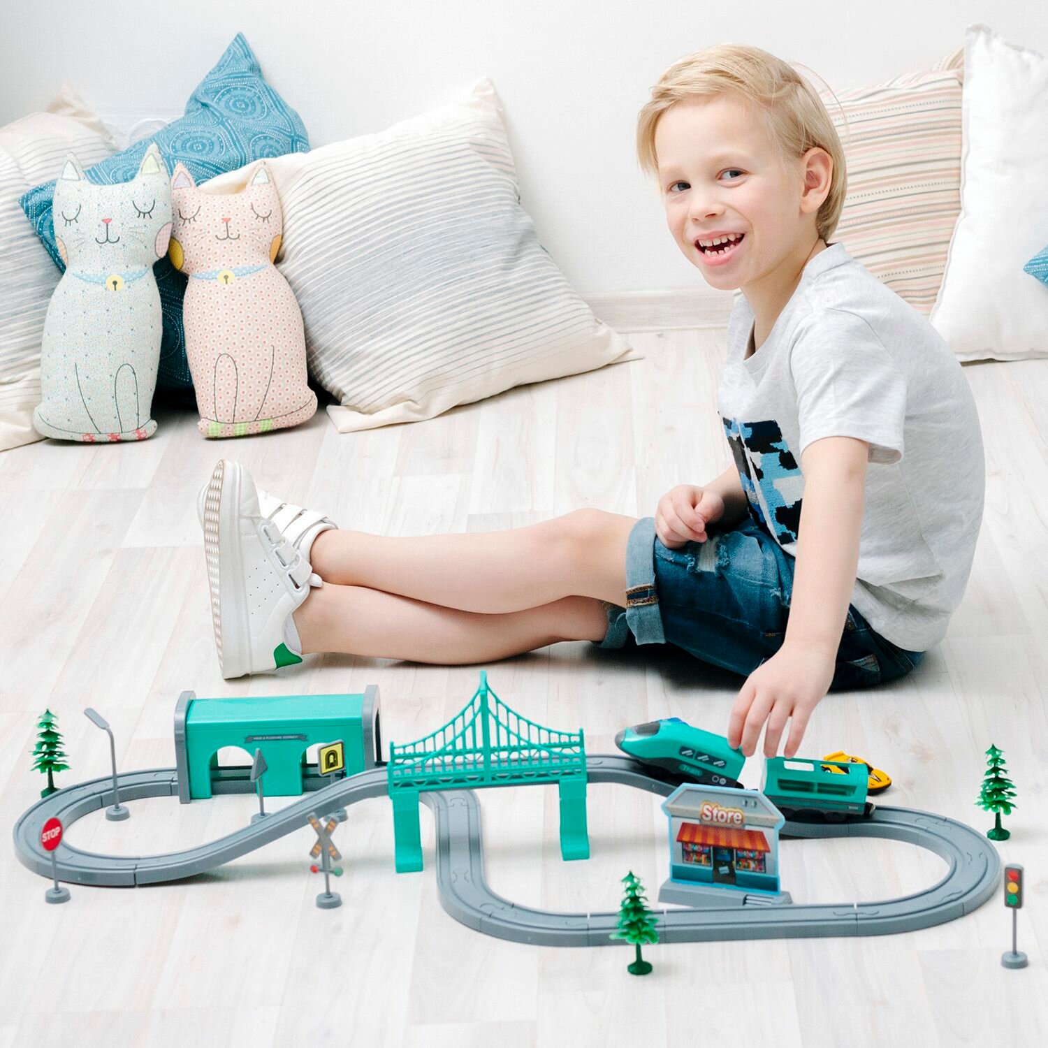 • Интерактивная железная дорога Мой город из 66 деталей покорит мальчиков и девочек от 3 лет.• Локомотив работает от батареек AAA.• При нажатии на кнопку, локомотив самостоятельно поедет по рельсам.• Локомотив выполнен в современном дизайне и в ярких цветах.• В локомотиве открывается кабинка для машиниста, в которую легко можно посадить фигурку человечка. • Вагоны поезда соединяются между собой с помощью надежных магнитов.• Комплектация: локомотив, один вагон, железная дорога, мост, туннель, вертолет, две машинки, магазин, дорожные знаки - 6шт. и фигурка городского жителя.• Игрушка изготовлена из прочного и безопасного пластика, устойчивого к механическому воздействию.• Все элементы комплекта совместимы с другими сборными моделями железной дороги «Givito». • Юный машинист сможет прокладывать различные маршруты, строить новые станции и придумывать уникальный ландшафт.• Игра с набором способствует развитию навыков в сюжетно-ролевой игре, стимулирует зрительно-моторную координацию.• Большой набор идеально подходит как для самостоятельной игры ребенка, так и игры с друзьями. • Железная дорога - отличный подарок на День рождения, Новый год и любой другой праздник.