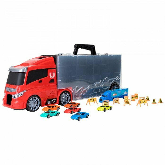 Givito "Мой город" (Автовоз - кейс 59 см красный с тоннелем. Набор из 6 машинок 1 фуры и 12 дорожных знаков)