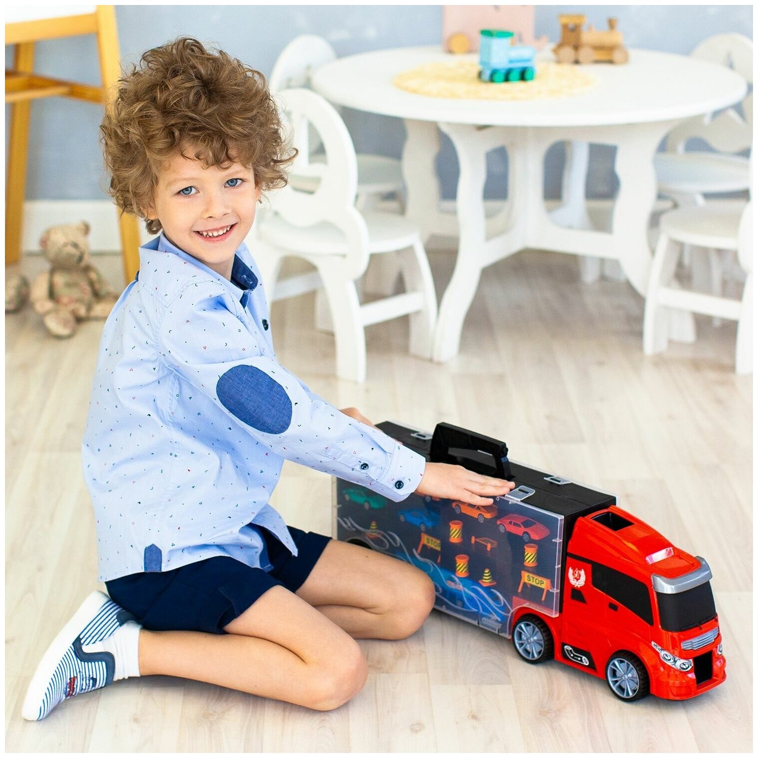 Givito Набор машинка Мой город Автовоз-кейс 59 см с аксессуарами • Автовоз Givito – 2 в 1: игрушечный грузовой автомобиль и система хранения для маленьких машинок. • Длина грузовика - 59 см. • Автовоз является уменьшенной копией реального современного прототипа. • Колеса автовоза подвижные, поэтому он легко катается по поверхности. • Автовоз оснащен удобной ручкой, что позволяет брать его с собой. • В кабину встроен ускоритель машинок, который придаст игре еще больше динамики. • Машинки хранятся в удобных ячейках в кузова с прозрачной крышкой. • Все машинки в наборе изготовлены из безопасного цветного пластика, с подвижными колесами. • Мини машинки выполнены очень реалистично с высокой детализацией. • Каждая машинка в наборе уникальна и имеет свой цвет. • В комплекте: автовоз-система хранения, 6 машинок, 12 дорожных знаков. • Изделие изготовлено из безопасного высококачественного прочного пластика • Игра с машинками развивает воображение, стимулирует развитие моторных навыков и координации движения. • Рекомендуется для мальчиков от 3 лет.