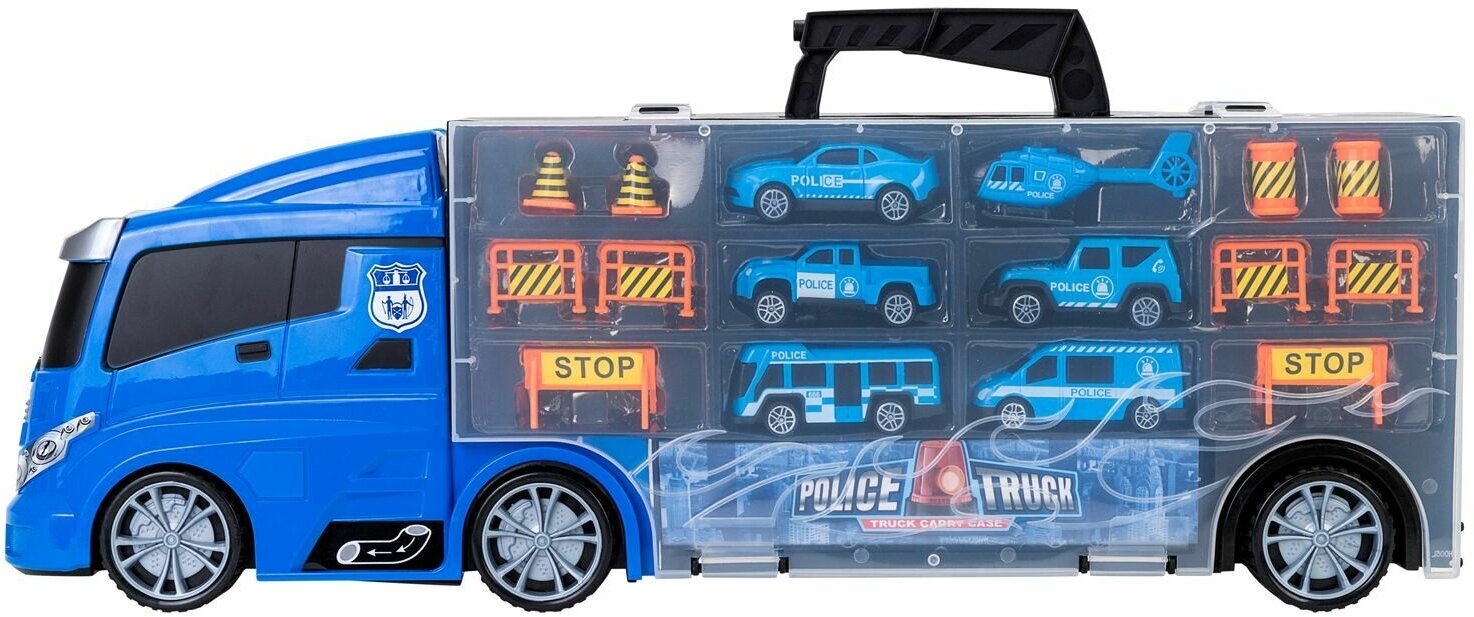 Givito "Полицейский участок" (Автовоз - кейс 515 см синий с тоннелем. 4 машинки 1 автобус 1 вертолет и 10 дорожных знаков)