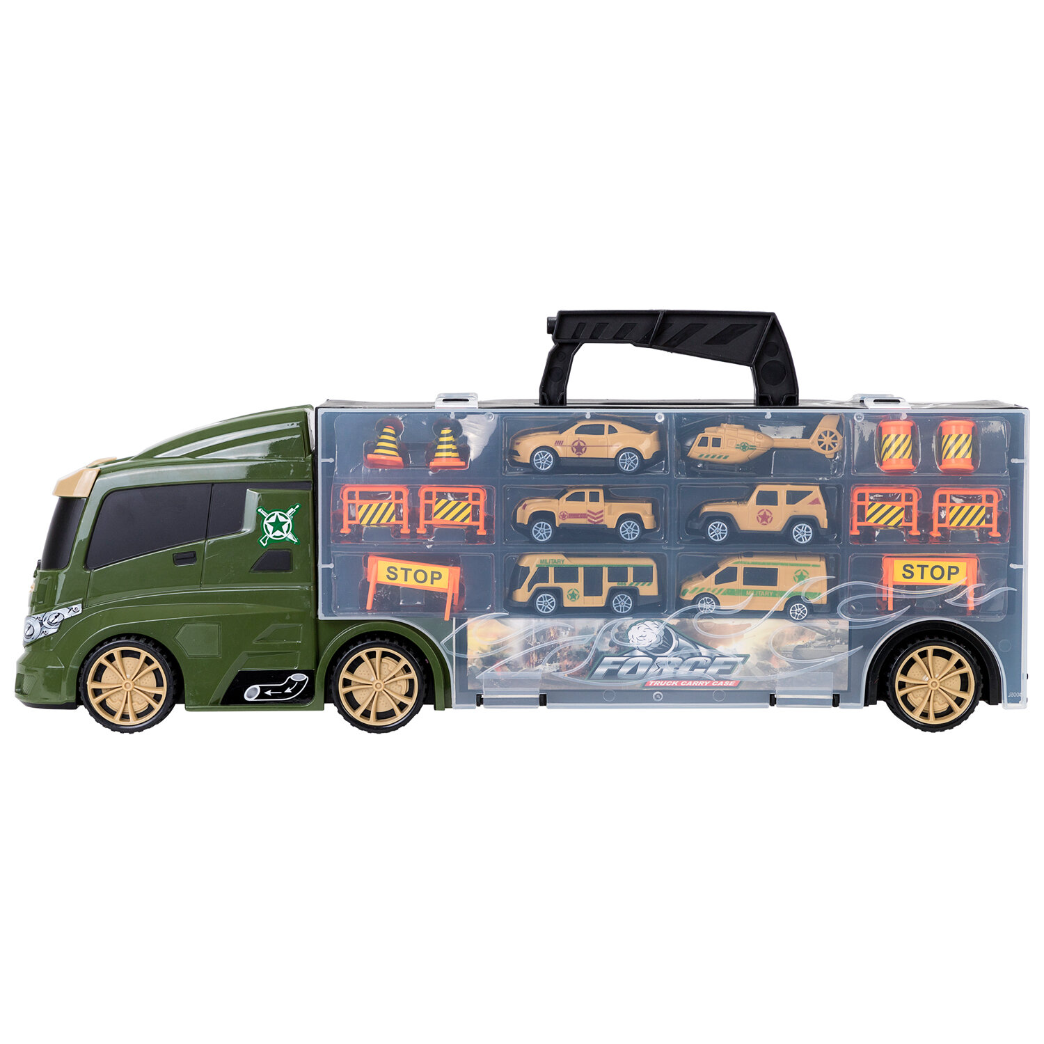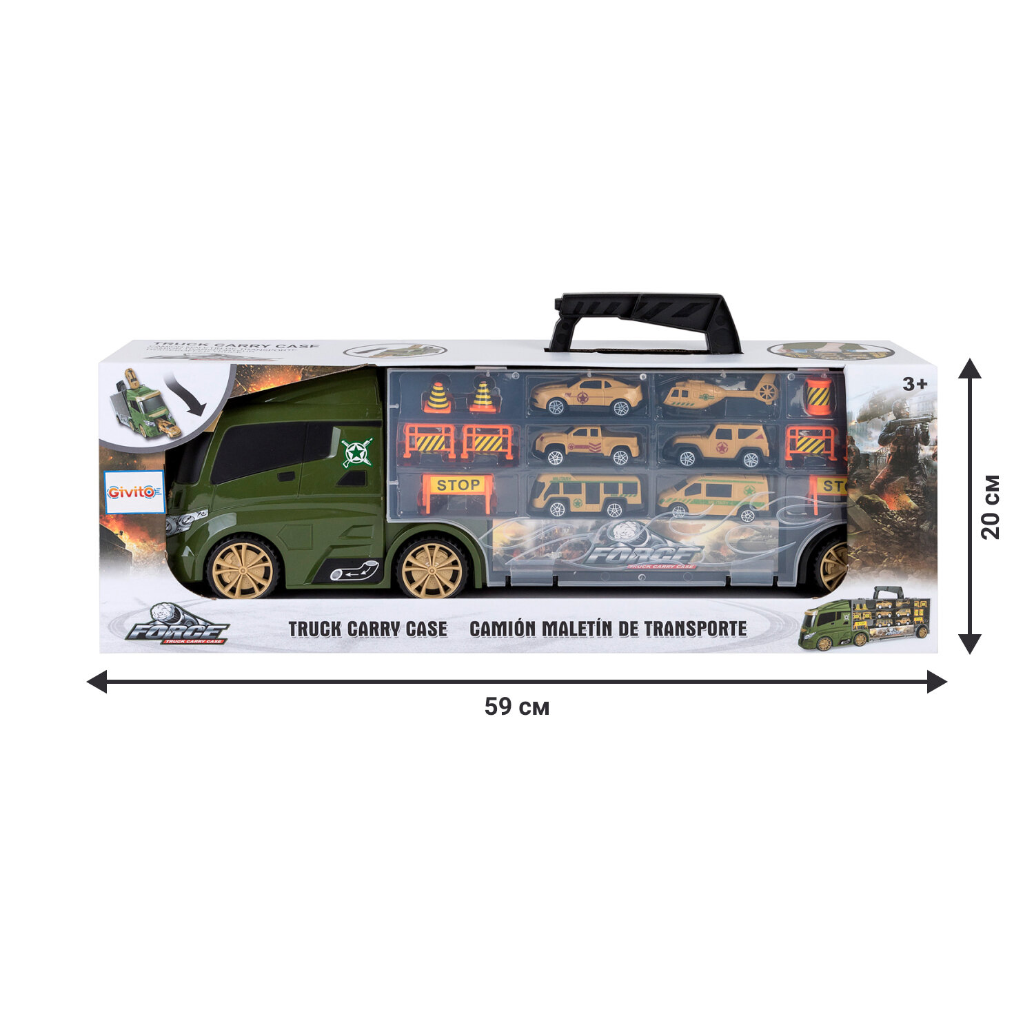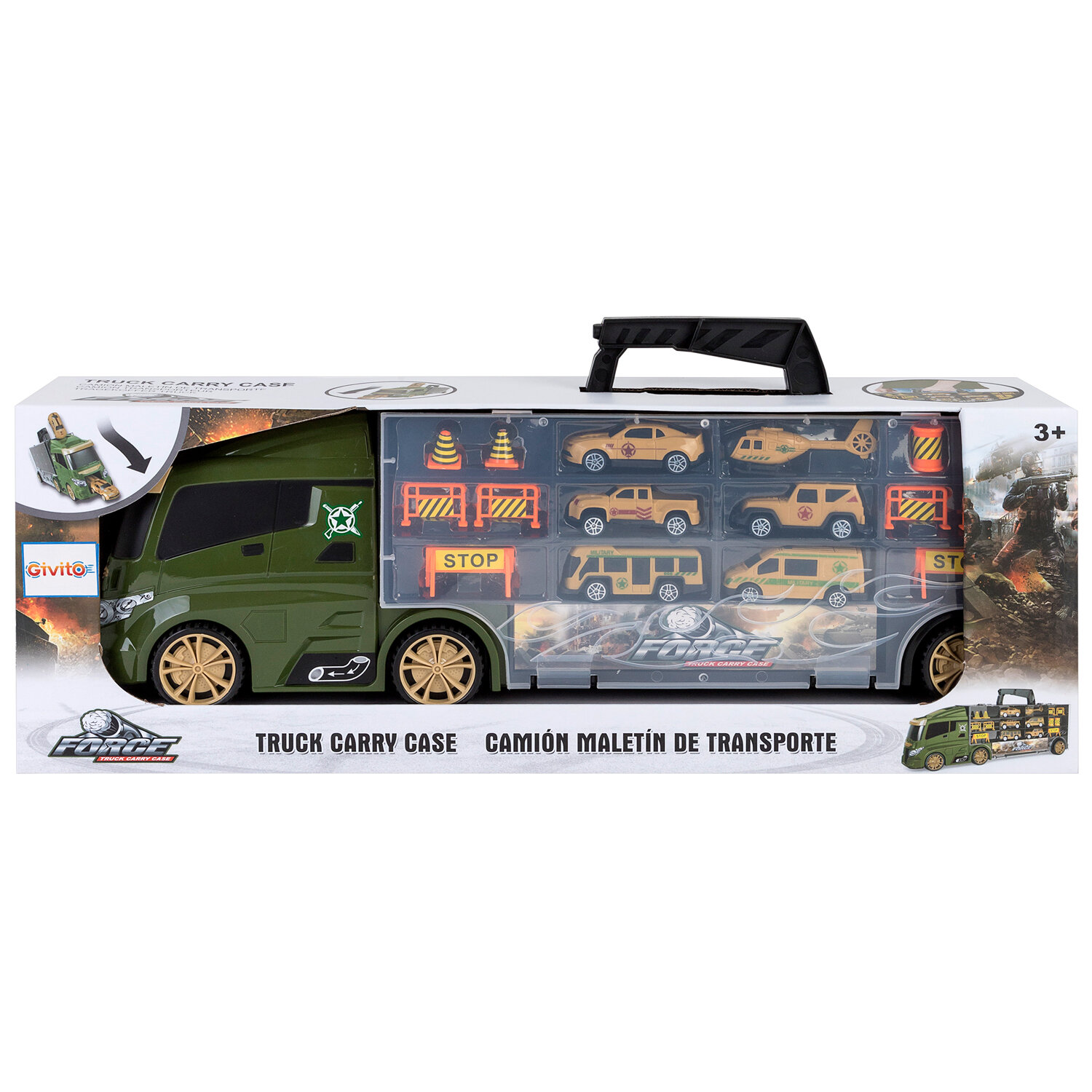 Givito Набор машинок Милитари (Автовоз-кейс 51.5 см с аксессуарами) • Автовоз Милитари Givito – 2 в 1: игрушечный грузовой автомобиль и система хранения для маленького транспорта. • Длина грузовика – 51,5 см. • Военный Автовоз покрашен в цвет милитари и имеет современный стиль. • Колеса автовоза подвижные, поэтому он легко катается по поверхности. • Автовоз оснащен удобной ручкой, что позволяет брать его с собой. • В кабину встроен ускоритель машинок, который придаст игре еще больше динамики. • Машинки хранятся в удобных ячейках в кузова с прозрачной крышкой. • Вся техника в наборе изготовлена из безопасного пластика, с подвижными колесами. • Мини служебная техника выполнена очень реалистично. Каждый автомобиль уникален и покрашен в единый цвет. • В комплекте: автовоз-система хранения, 5 военных автомобилей, вертолет, 10 дорожных знаков. • Изделие изготовлено из безопасного высококачественного прочного пластика. • Рекомендуется для мальчиков от 3 лет.