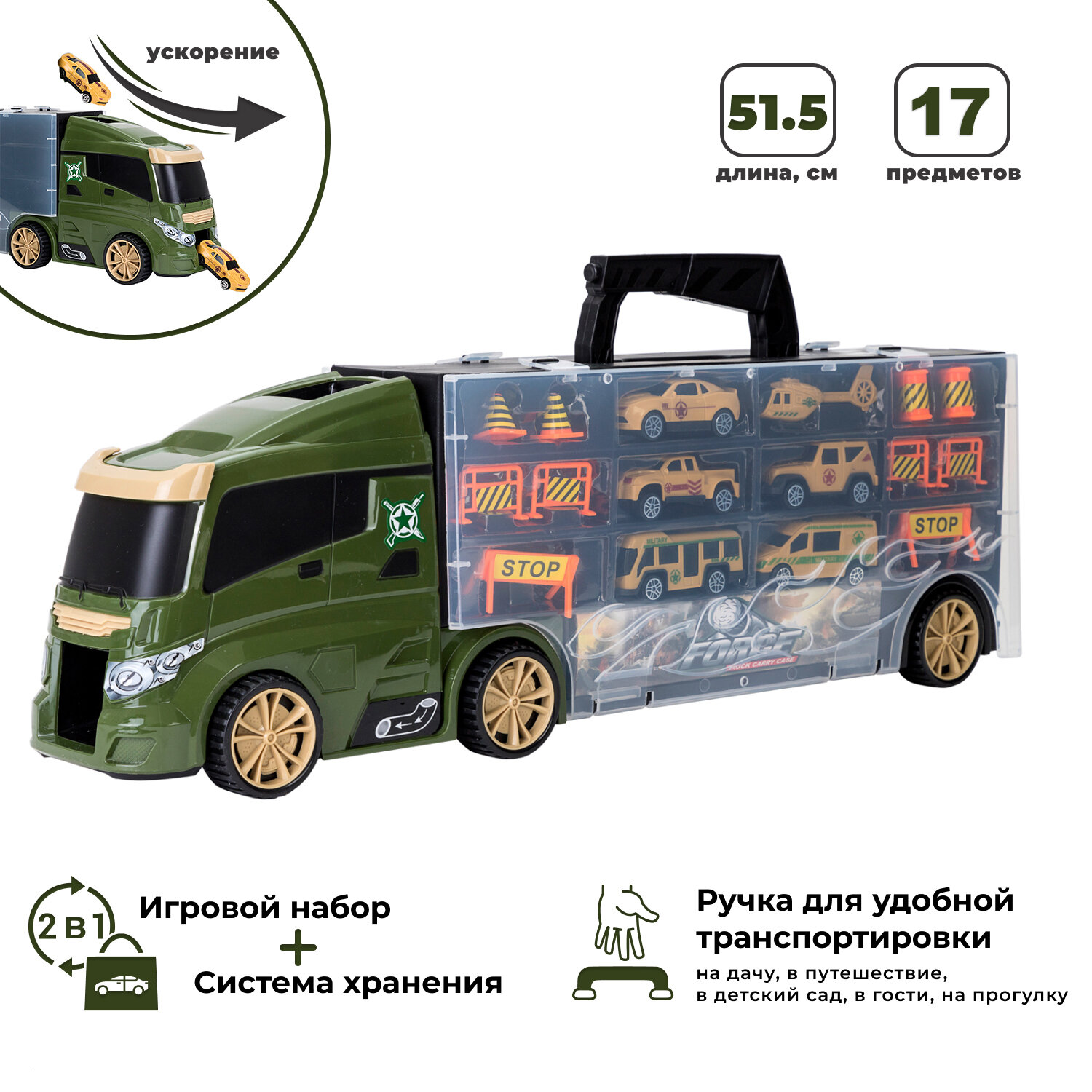Givito "Милитари" (Автовоз - кейс 515 см зеленый с тоннелем. 4 машинки 1 автобус 1 вертолет и 10 дорожных знаков)