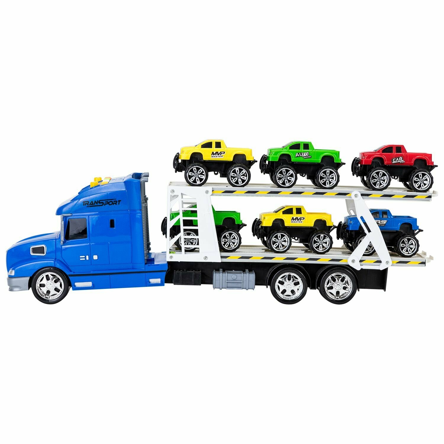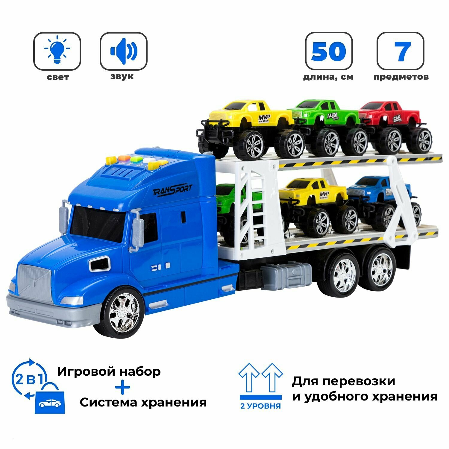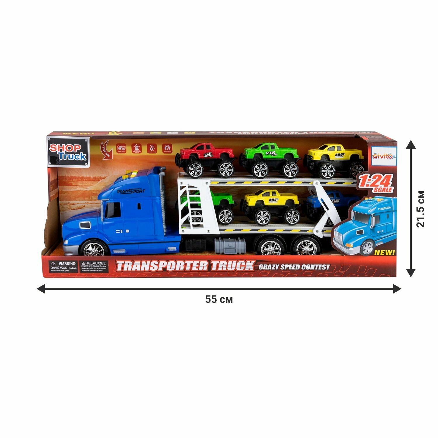 Givito "Мой город" (Автовоз - тягач 50 см со светом и звуком синий. 6 машин - пикапов)