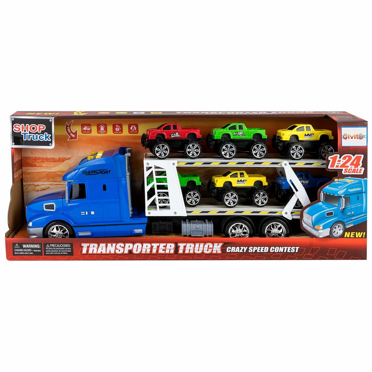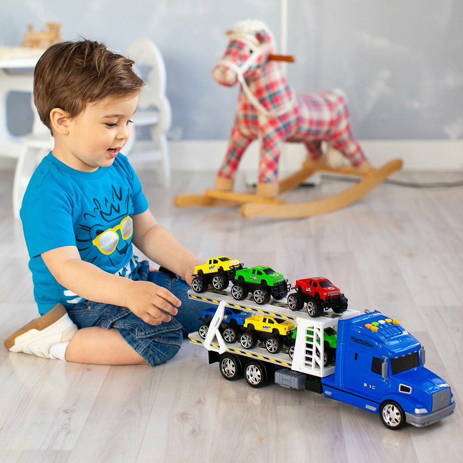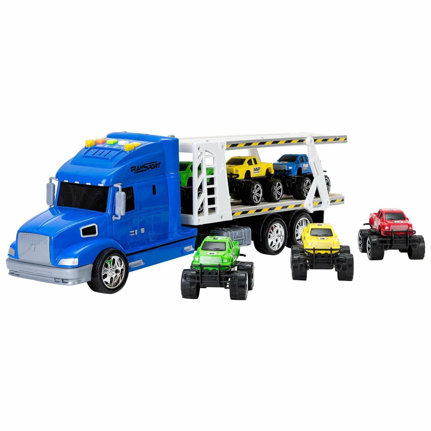 Givito "Мой город" (Автовоз - тягач 50 см со светом и звуком синий. 6 машин - пикапов)