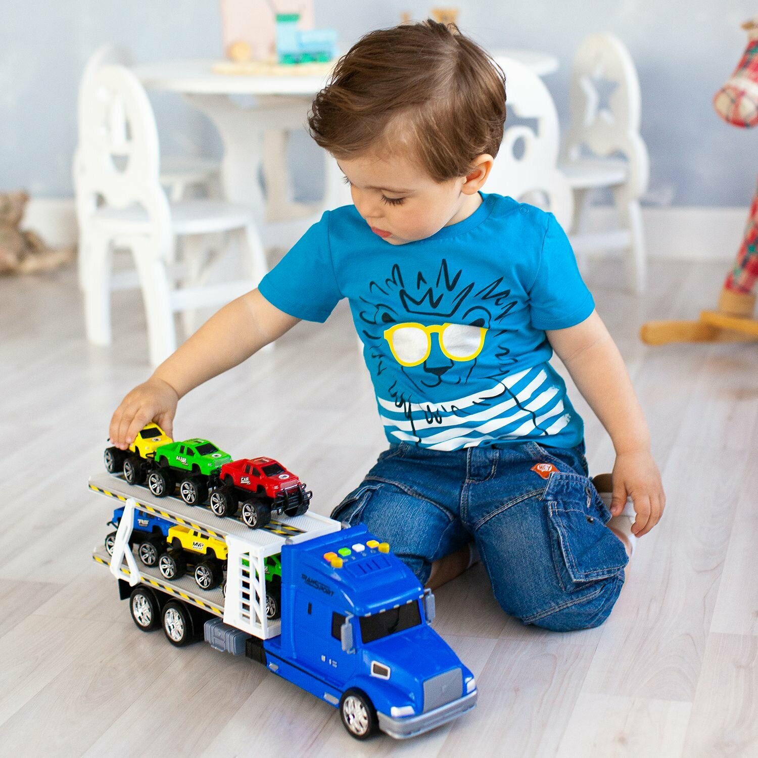 Givito Набор Машинки Мой город (Автовоз-тягач 50 см и 6 машин-пикапов) • Автовоз с машинками Givito – игрушечный грузовой автомобиль с двухуровневым прицепом и с 6 пикапами. • Длина грузовика – 50 см. • При нажатии на кнопки на кабине автовоза издаются звуки: работающего мотора, клаксона, сирены. Ребенок может переключаться между несколькими режимами и поучать другой звук. • При активации режима загорается и мигает сирена на крыше кузова атовоза. • Колеса автовоза подвижные, поэтому он легко катается по поверхности. • В распоряжении мальчишек появится реалистичная машинка, в виде автовоза с двухуровневым прицепом для перевозки 6 автомобилей. • В комплекте: автовоз, 6 разноцветных машинок. • Играть с машинами из набора можно как одному, так и с друзьями. • Яркая окраска и характерный дизайн делают модели реалистичными и узнаваемыми. • Вся техника в наборе изготовлена из безопасного пластика, с подвижными колесами. • Изделие изготовлено из безопасного высококачественного прочного пластика. • В процессе катания машинок и игр с ними, ребенок проявит фантазию и воображение, улучшит мелкую моторику рук и координацию движений. • Рекомендуется для мальчиков от 3 лет.