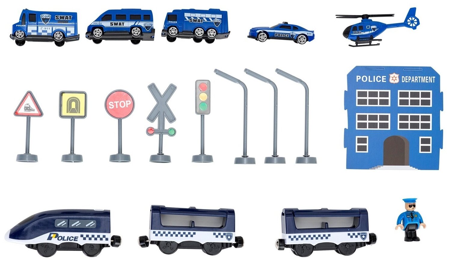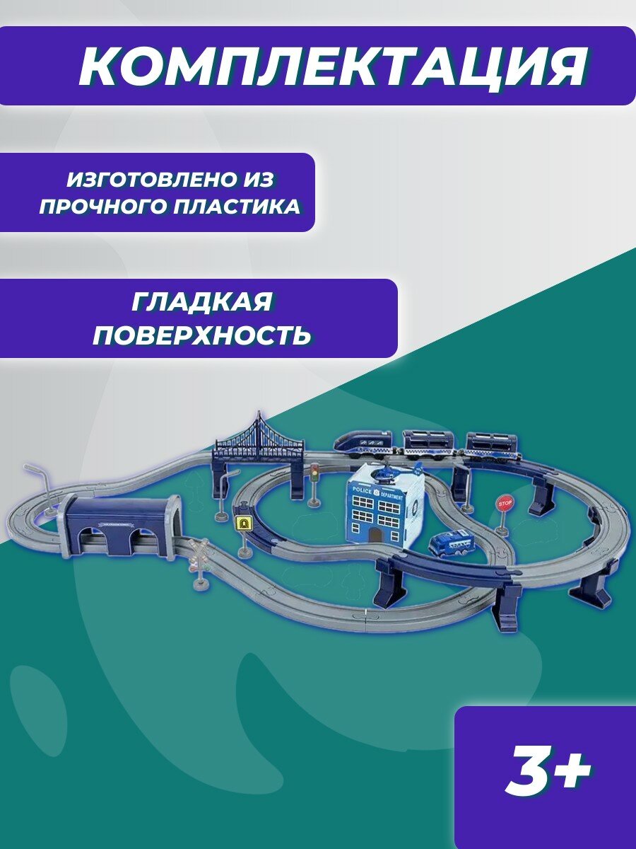 • Интерактивная железная дорога Полицейский участок подходят для мальчиков и девочек от 3 лет. • Юный машинист сможет прокладывать различные маршруты, строить новые станции и придумывать уникальный ландшафт.• Игрушка изготовлена из прочного и безопасного пластика, устойчивого к механическому воздействию.• При нажатии на кнопку, локомотив самостоятельно поедет по рельсам.• При движении через туннель издает звук.• Локомотив работает от батареек AAA.• Локомотив выполнен в современном стиле и в дизайне Полиции, что понравиться юному любителю поездов.• В кабину локомотива можно посадить фигурку полицейского. • Вагоны поезда соединяются между собой с помощью надежных магнитов.• Игра с набором способствует развитию навыков в сюжетно-ролевой игре, стимулирует зрительно-моторную координацию.• Большой набор идеально подходит для самостоятельной игры ребенка, так и игры с друзьями. • Комплектация: локомотив, 2 вагона, железная дорога, мост, туннель, четыре машинки, вертолет, здание, дорожные знаки - 6шт. и фигурка полицейского.• Все элементы комплекта совместимы с другими сборными моделями железной дороги «Givito». • Железная дорога - отличный подарок на День рождения, Новый год и любой другой праздник.