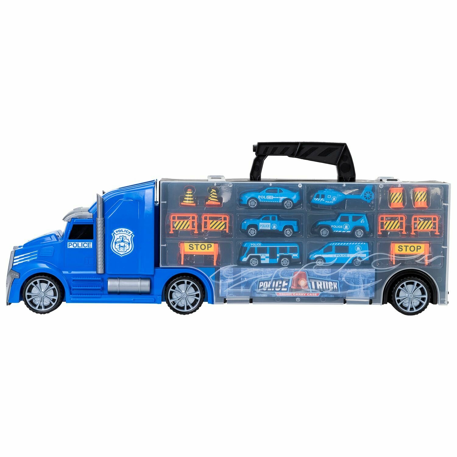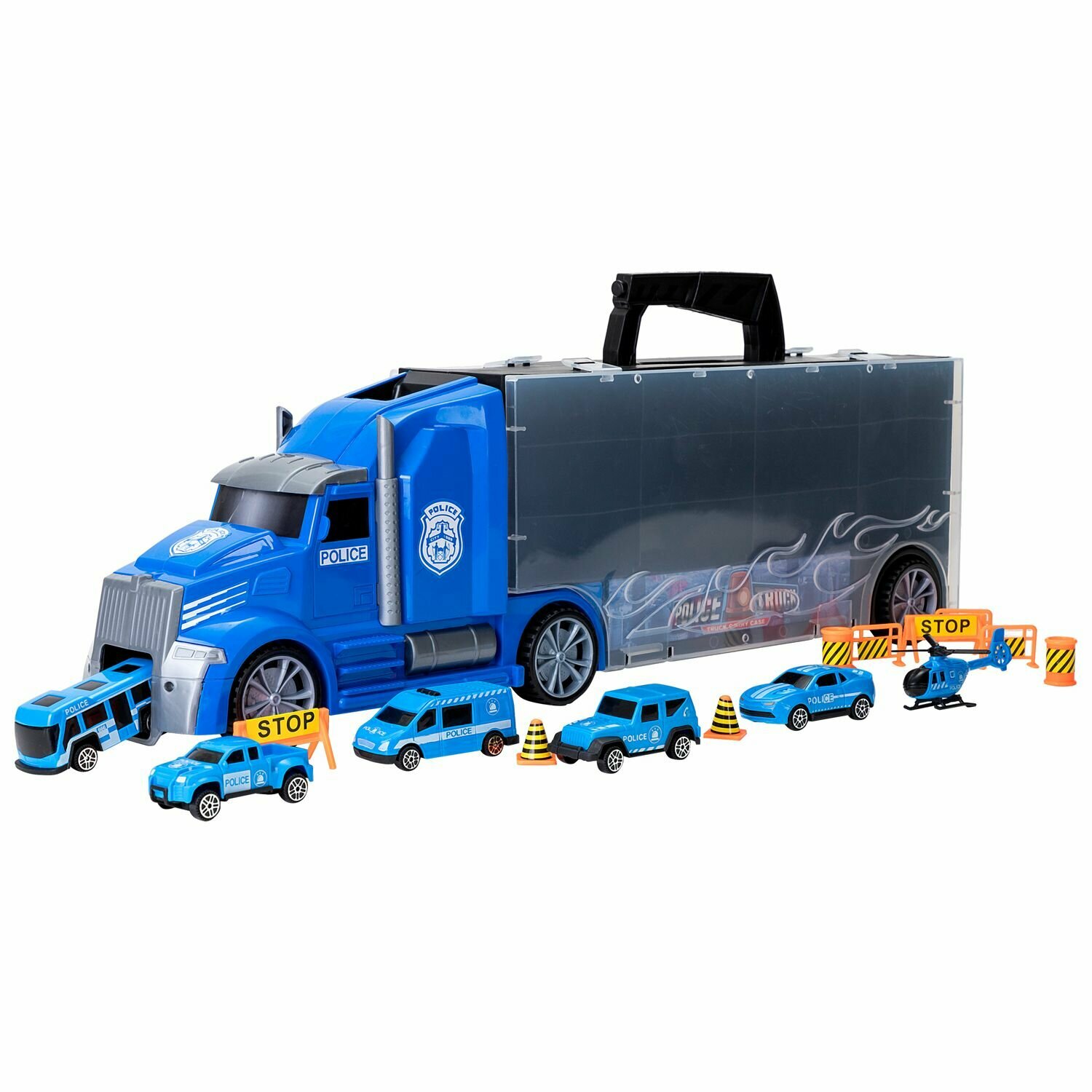 Givito "Полицейский участок" (Автовоз - кейс 54 см синий с тоннелем. 4 машинки 1 автобус 1 вертолет и 10 дорожных знаков)