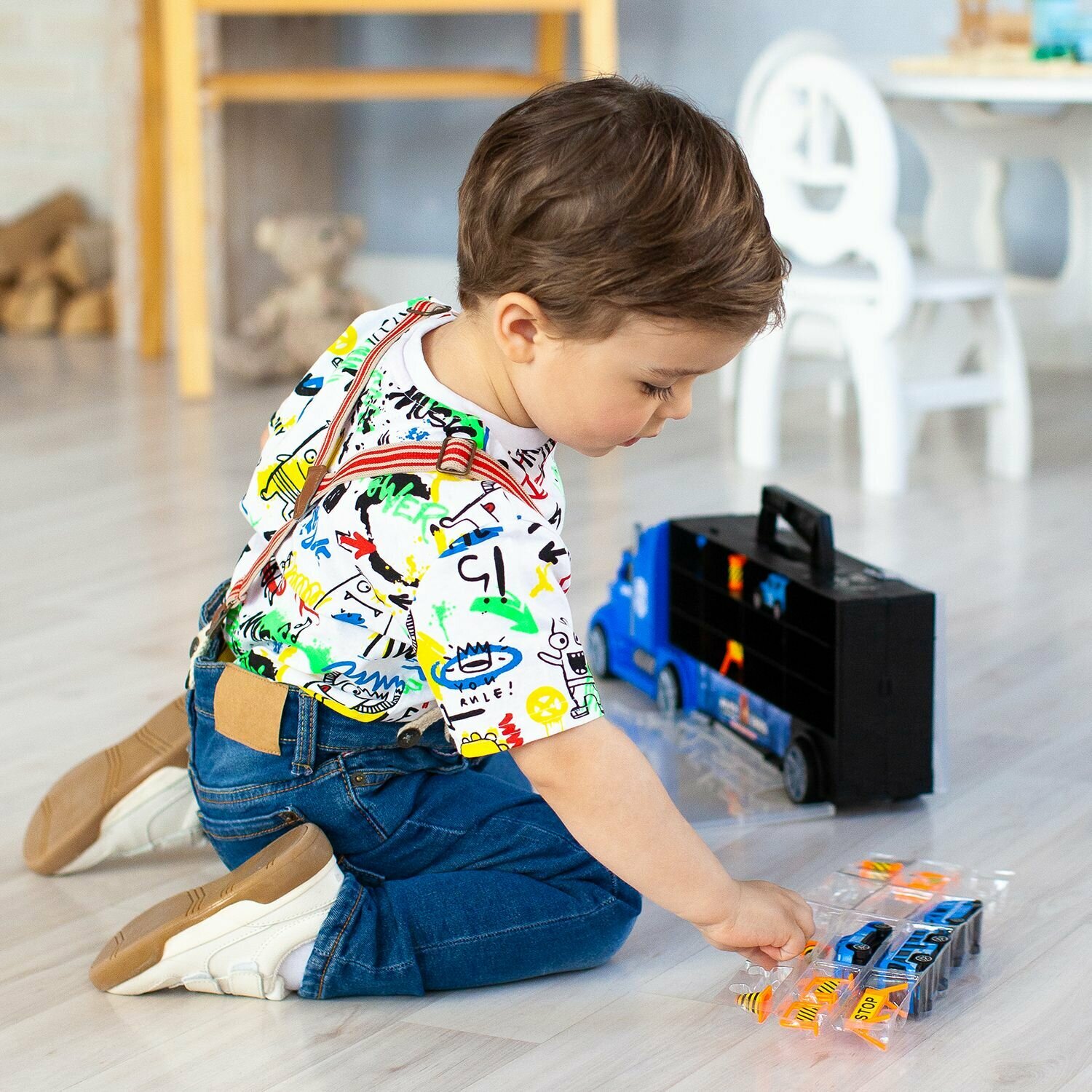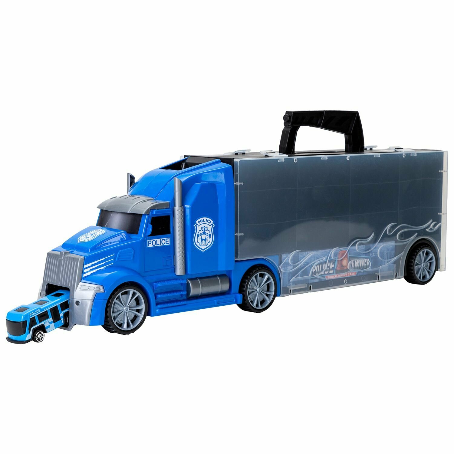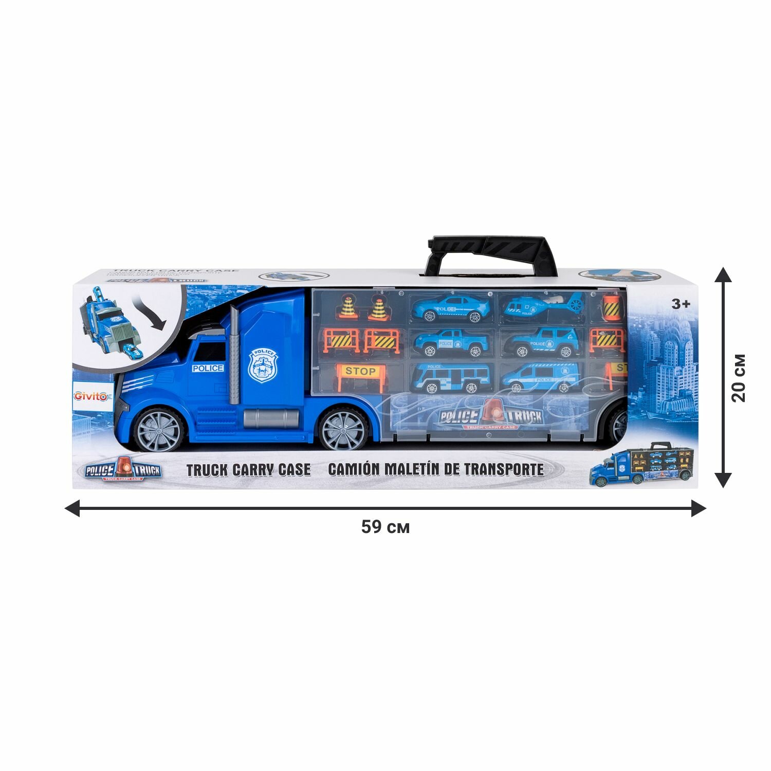 Givito Набор машинок Полицейский участок Автовоз-кейс 54 см с аксессуарами • Автовоз Givito – 2 в 1: игрушечный грузовой автомобиль и система хранения для маленького транспорта. • Длина грузовика - 54 см. • Полицейский Автовоз выполненный в ретро-стиле покрашен в яркий синий цвет. • Колеса автовоза подвижные, поэтому он легко катается по поверхности. • Автовоз оснащен удобной ручкой, что позволяет брать его с собой. • В кабину встроен ускоритель машинок, который придаст игре еще больше динамики. • Машинки хранятся в удобных ячейках в кузова с прозрачной крышкой. • Вся техника в наборе изготовлена из безопасного пластика, с подвижными колесами. • Мини служебная техника выполнена очень реалистично. Каждый автомобиль уникален и покрашен в единый цвет. • В комплекте: автовоз-система хранения, 5 служебных автомобилей полиции, вертолет, 10 дорожных знаков. • Изделие изготовлено из безопасного высококачественного прочного пластика. • Рекомендуется для мальчиков от 3 лет.