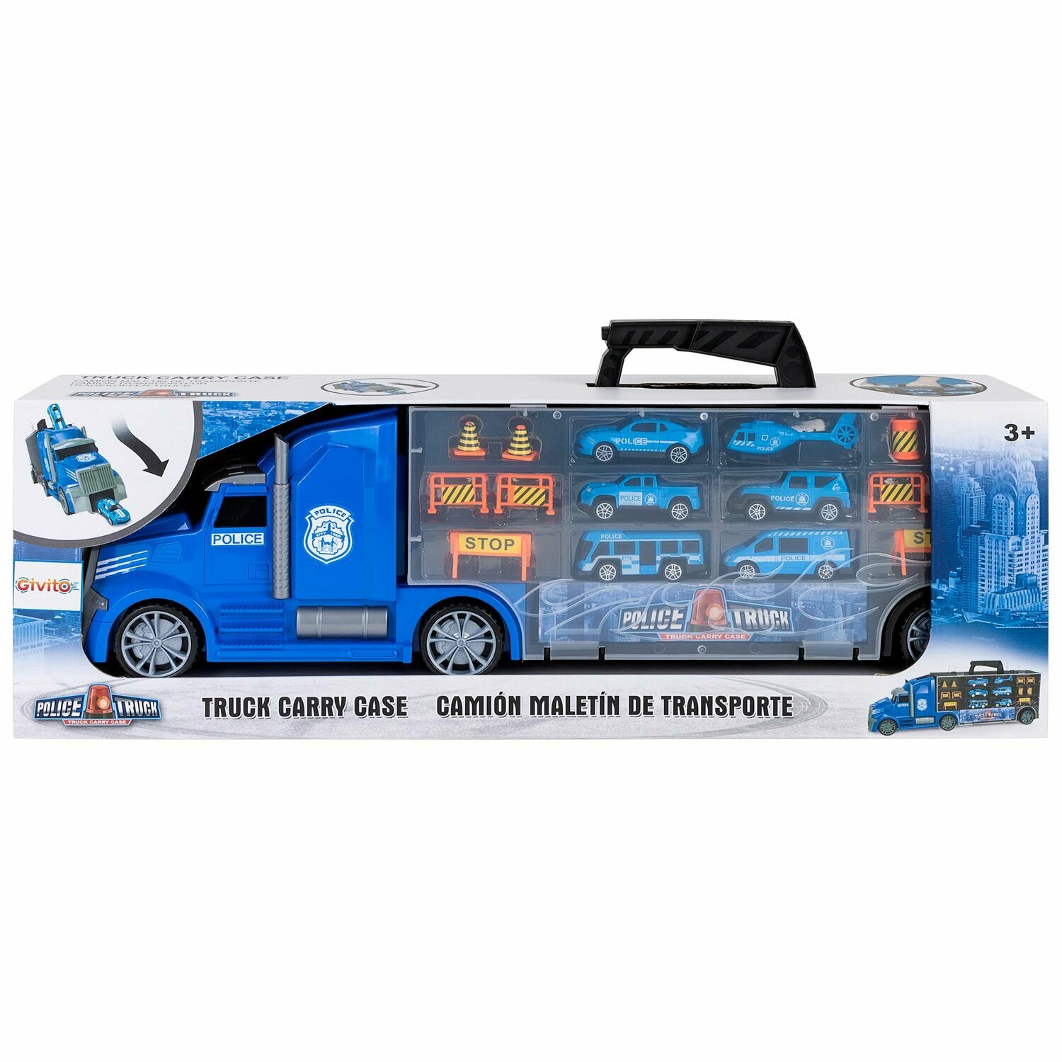 Сервис сравнения цен СкидкаГИД предлагает сравнить цены на товар «Givito "Полицейский участок" (Автовоз - кейс 54 см синий с тоннелем. 4 машинки 1 автобус 1 вертолет и 10 дорожных знаков)»