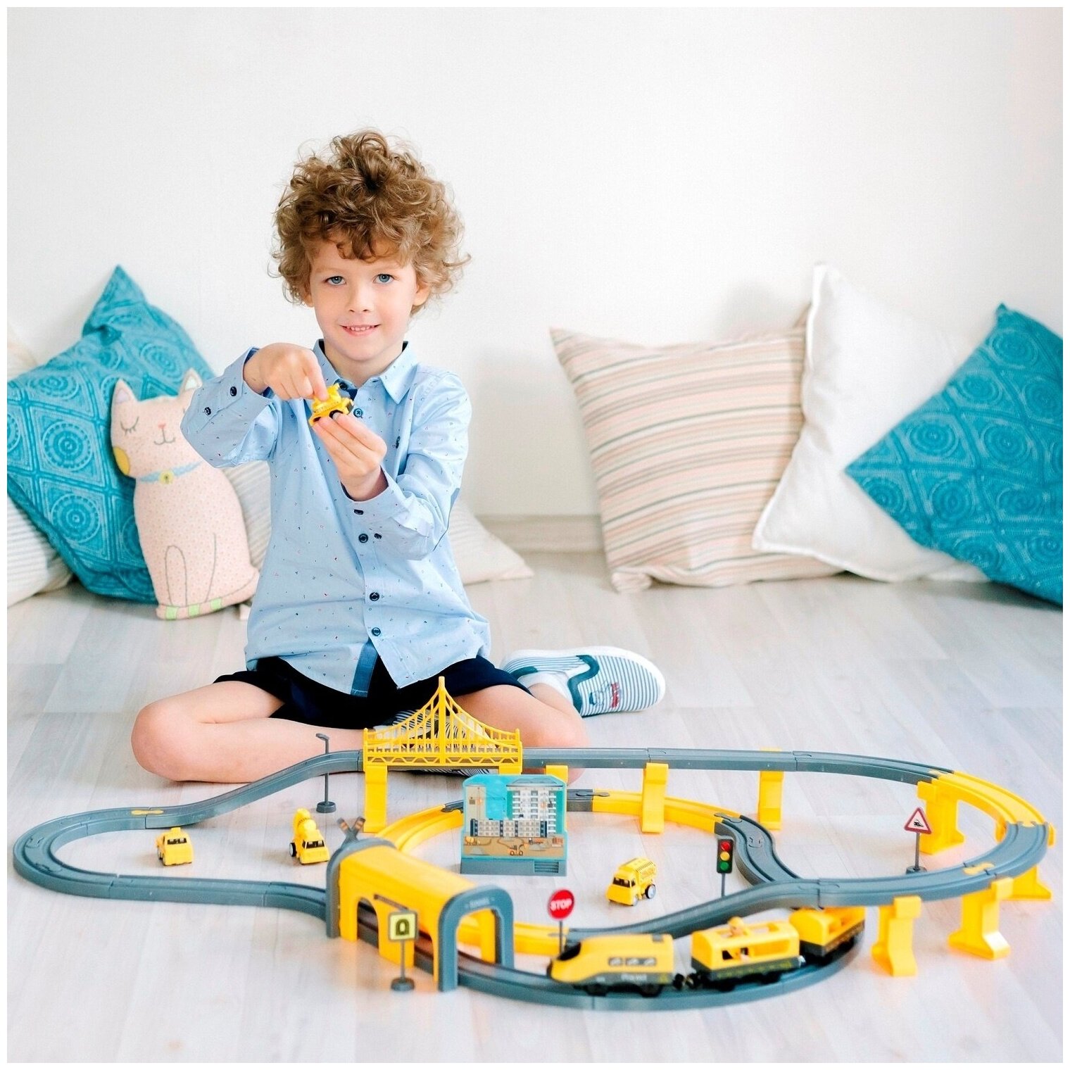 • Интерактивная железная дорога Строительная площадка порадует мальчиков и девочек от 3 лет.• Локомотив работает от батареек AAA.• При нажатии на кнопку, локомотив самостоятельно поедет по рельсам.• При движении через туннель издает звук.• Локомотив выполнен в современном стиле и в дизайне Строительной службы.• В локомотиве открывается кабинка для машиниста, в которую легко можно посадить фигурку строителя. • Комплектация: локомотив, 2 вагона, железная дорога, мост, туннель, четыре машинки, здание, дорожные знаки - 6шт. и фигурка строителя.• Вагоны поезда соединяются между собой с помощью надежных магнитов.• Игрушка изготовлена из прочного и безопасного пластика, устойчивого к механическому воздействию.• Игра с набором способствует развитию навыков в сюжетно-ролевой игре, стимулирует зрительно-моторную координацию.• Большой набор идеально подходит для самостоятельной игры ребенка, так и игры с друзьями. • Все элементы комплекта совместимы с другими сборными моделями железной дороги "Givito".• Юный строитель сможет прокладывать различные маршруты, строить новые станции и придумывать уникальный ландшафт.• Железная дорога - отличный подарок на День рождения, Новый год и любой другой праздник.