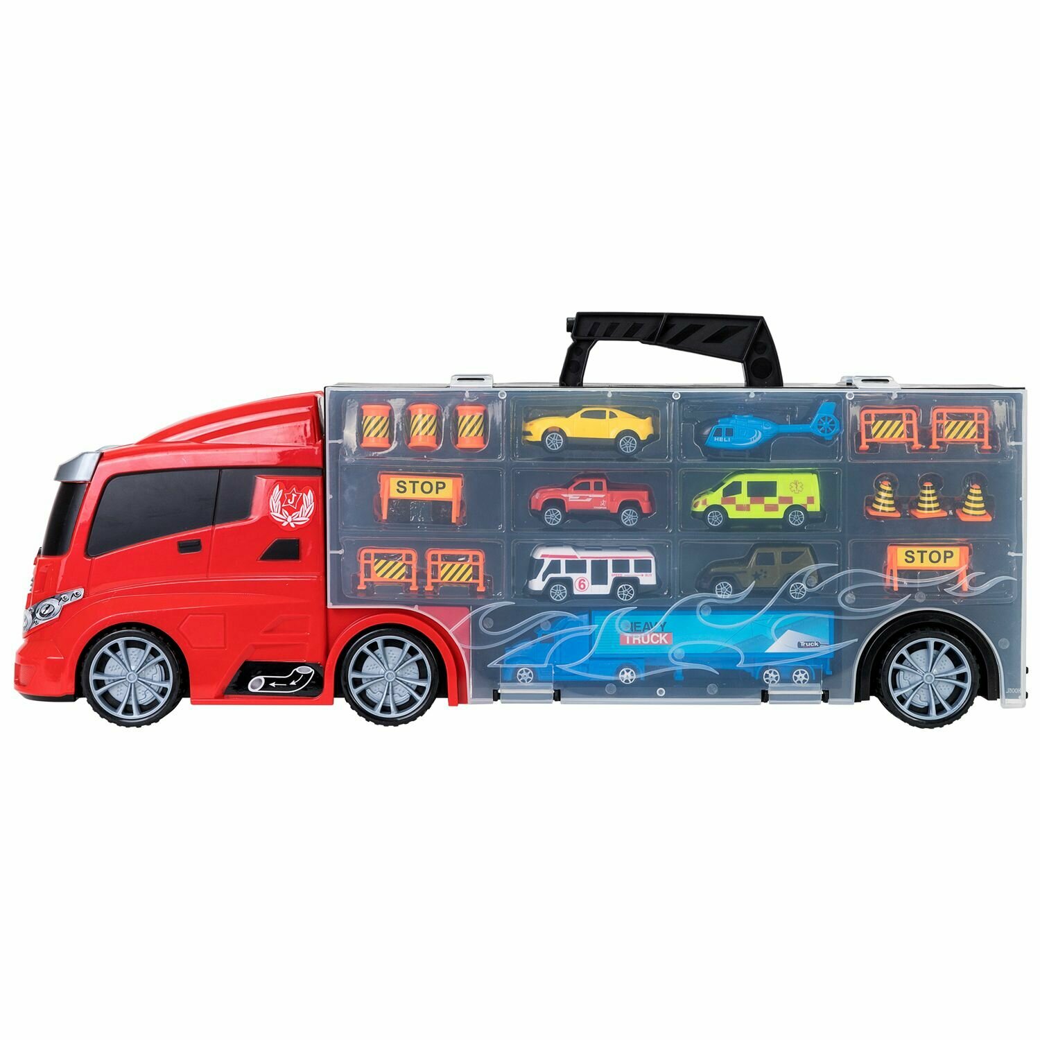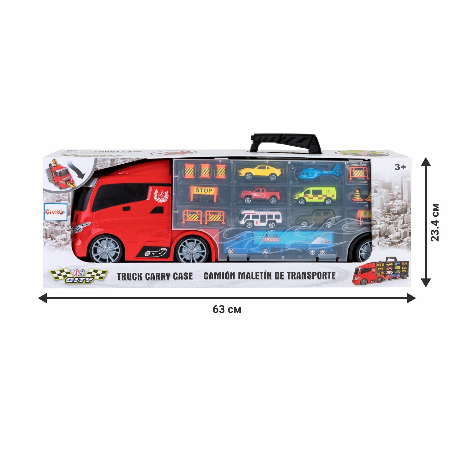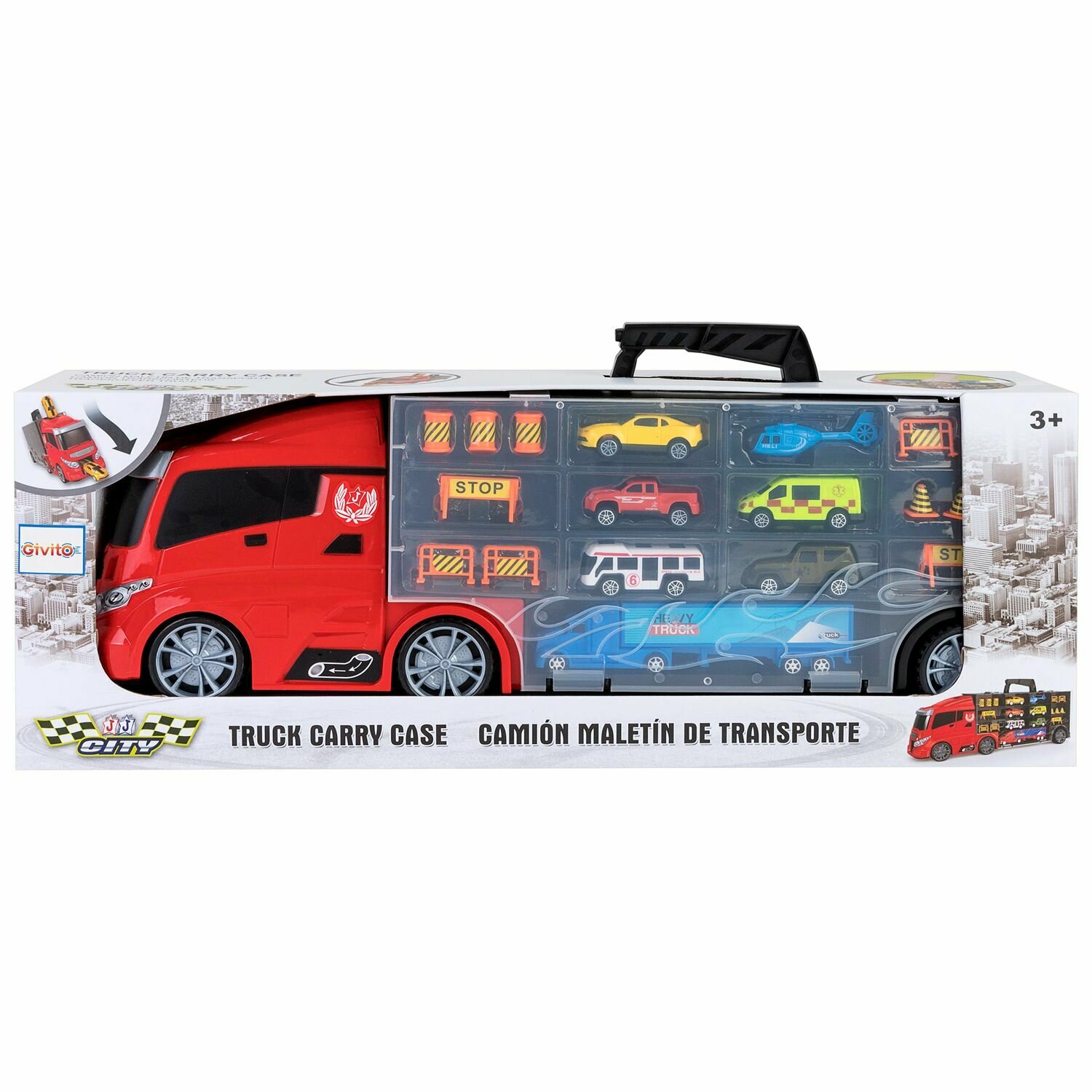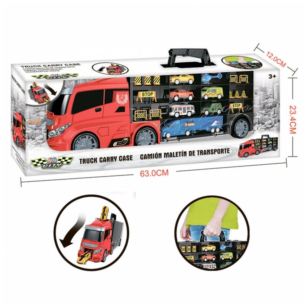 Givito "Мой город" (Автовоз - кейс 59 см красный с тоннелем. Набор из 4 машинок 1 автобуса 1 вертолета 1 фуры и 12 дорожных знаков)