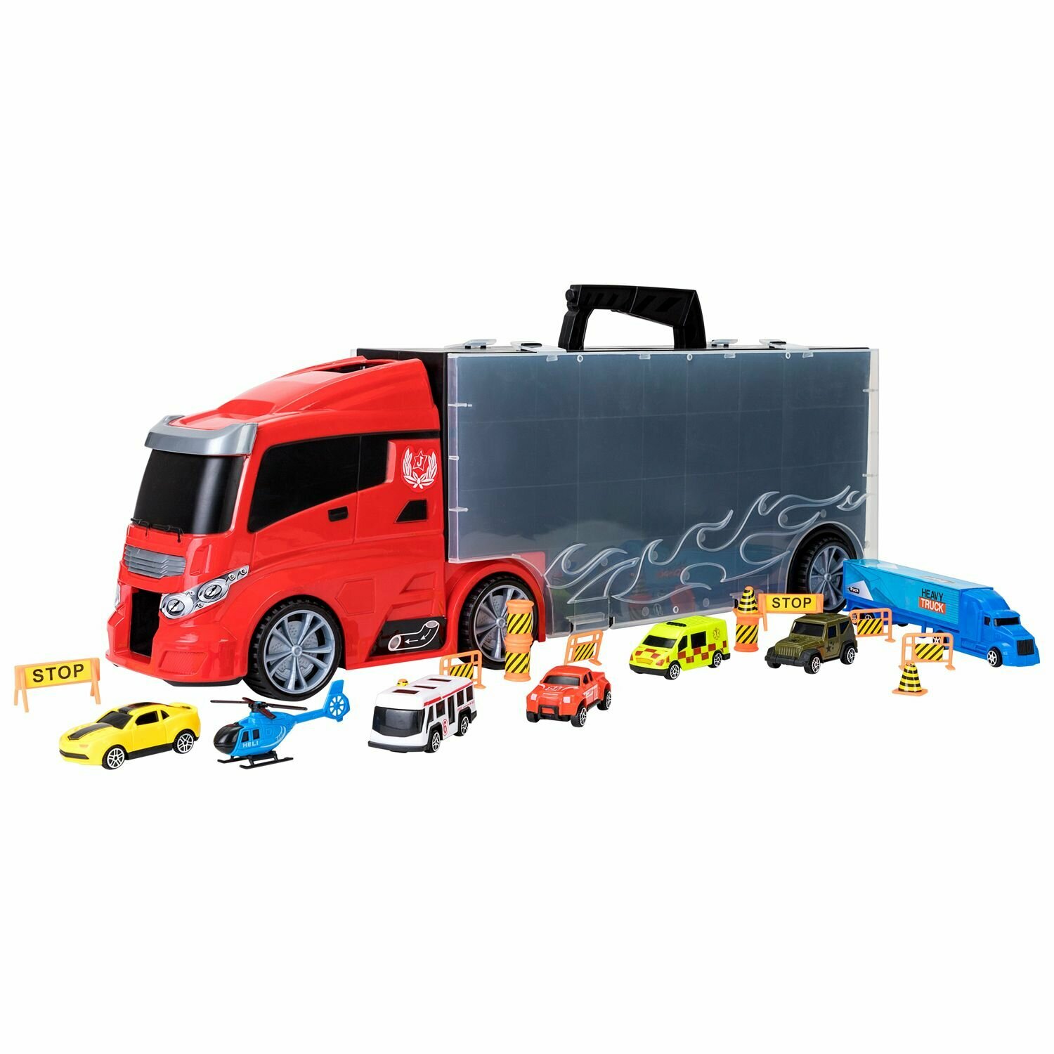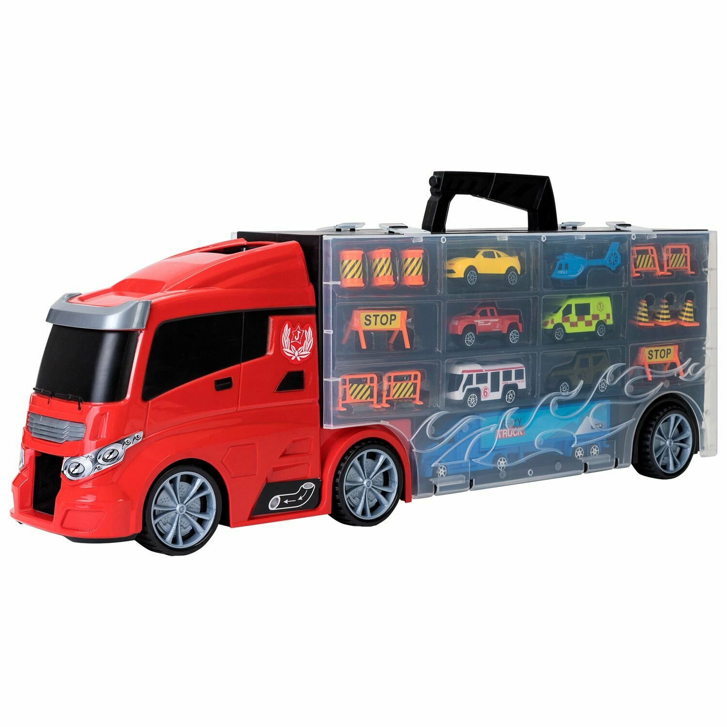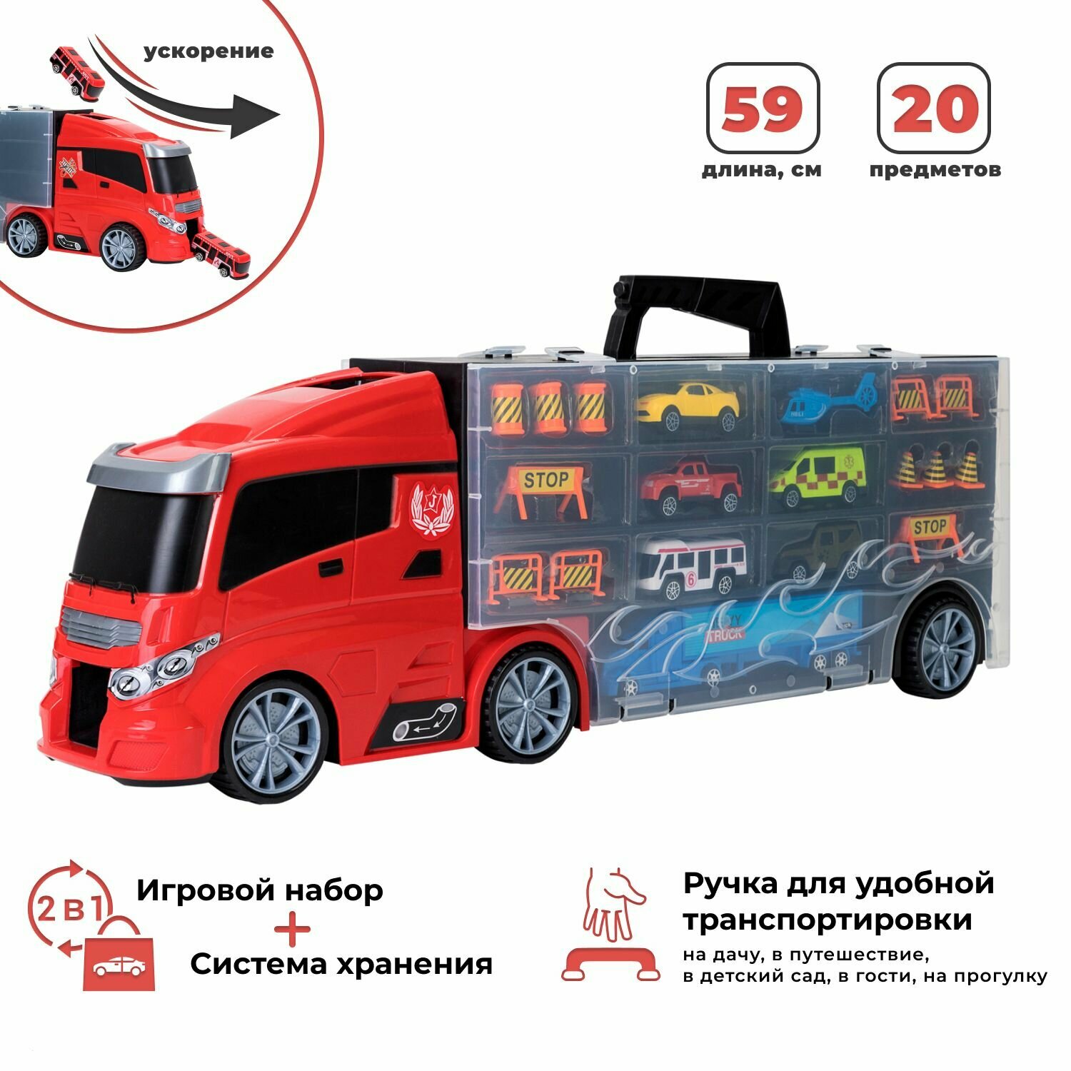 Givito "Мой город" (Автовоз - кейс 59 см красный с тоннелем. Набор из 4 машинок 1 автобуса 1 вертолета 1 фуры и 12 дорожных знаков)