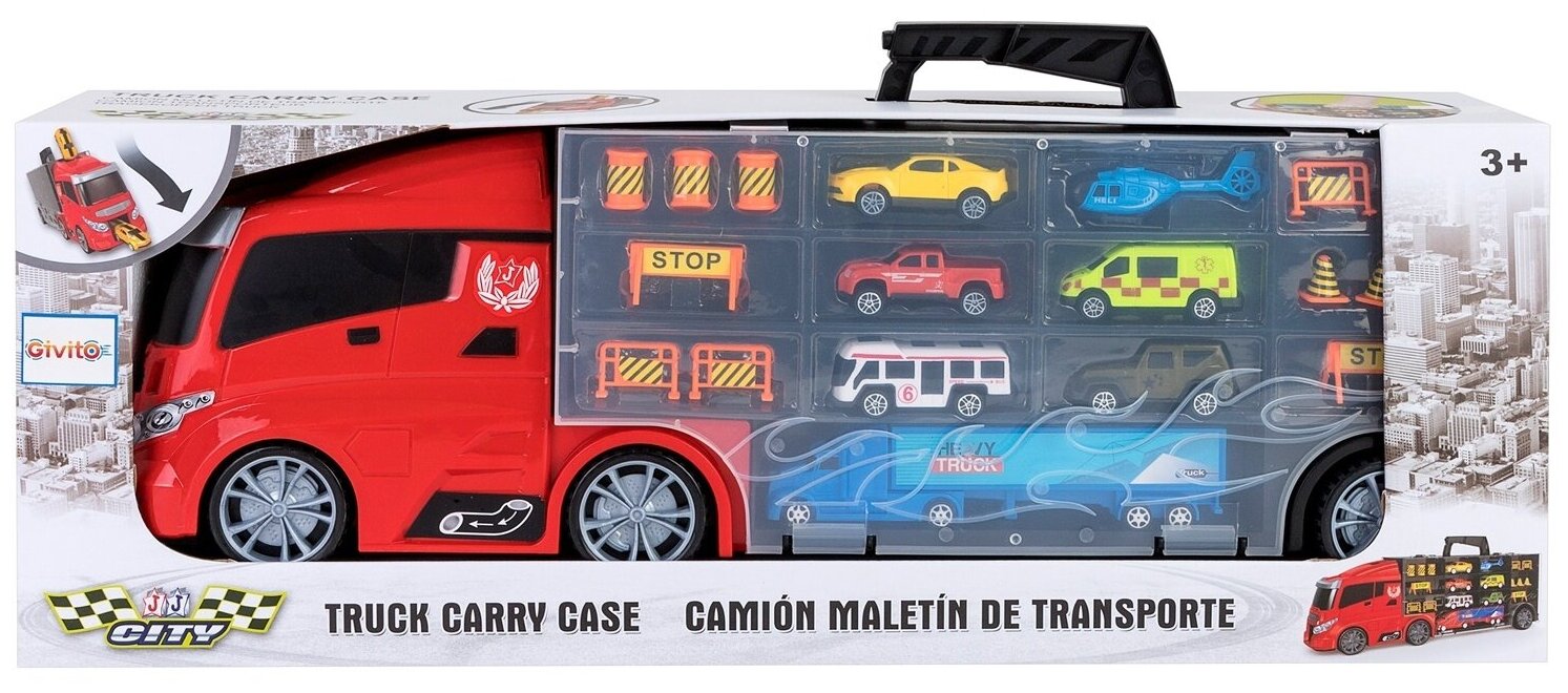 Сервис сравнения цен СкидкаГИД предлагает сравнить цены на товар «Givito "Мой город" (Автовоз - кейс 59 см красный с тоннелем. Набор из 4 машинок 1 автобуса 1 вертолета 1 фуры и 12 дорожных знаков)»