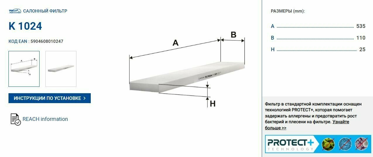 Фильтр салона FILTRON K 1024 для VW Sharan, Seat Alhambra 1.8T/2.0/2.8/1.9DTi 95-10 изготавливается с помощью высококачественных фильтрующих материалов, которые обладают электростатическими свойствами и, таким образом, способны удерживать даже микроскопические частицы вредных примесей (в несколько десятков раз меньше диаметра человеческого волоса).Дополнительная защита благодаря технологии PROTECT+Технология PROTECT+ уменьшает риск аллергических реакций и защищает пассажиров от аллергенов, бактерий и плесени, которые могут появиться на фильтре. Технология PROTECT+ основана на видимом под микроскопом покрытии из специальных микрочастиц. Эта технология используется в качестве стандартной в каждом фильтре салона FILTRON.Соответственно подобранное количество активированного угляСалонные фильтры с активированным углем, помимо твердых частиц, задерживают вредные газы и запахи. Количество активированного угля в фильтре подбирается таким образом, чтобы фильтр мог долго и эффективно очищать воздух от вредных летучих органических соединений.