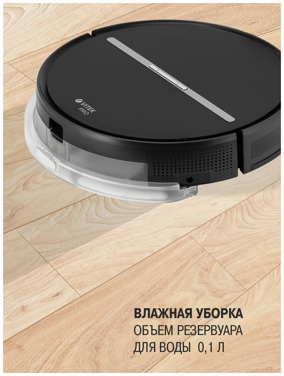 Сделать ваш дом по-настоящему чистым поможет компактный робот-пылесос VITEK , выполненный в стильном лаконичном дизайне. Прибор способен производить не только сухую уборку пола и коврового покрытия высотой до 1,4 см, но и качественную влажную уборку.