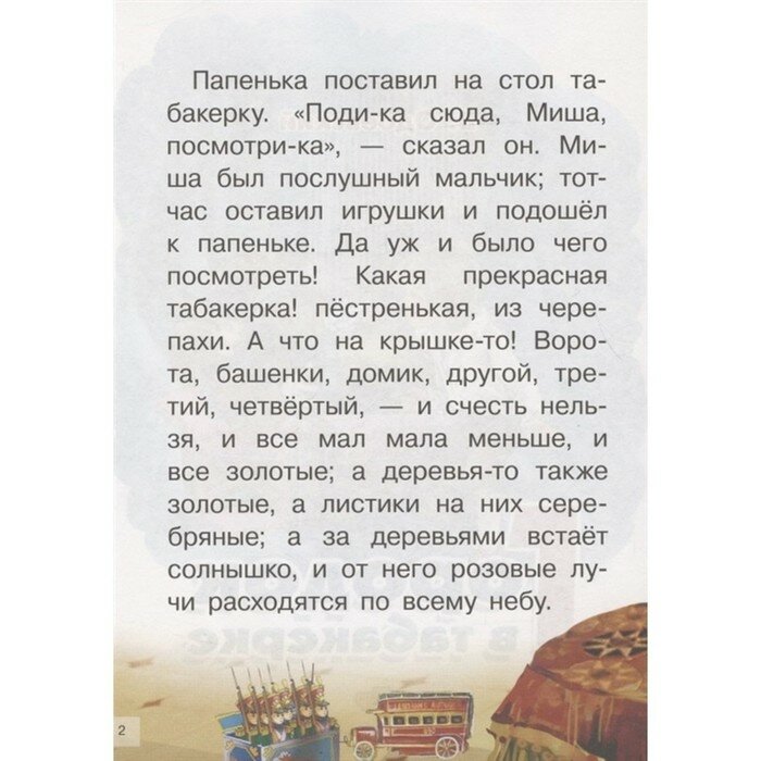 «Городок в табакерке»- первая научно-фантастическая сказка в русской детской литературе,написанная Владимиром Одоевским в 1834 году. Это очень талантливый писатель,чьё творчество сравнивали с Г.Х.Андерсеном. Сказка «Городок в табакерке» развивает в ребенке такие личностные качества как внимательность,усидчивость,послушание. Заказывала своему сыну-непоседе)),ведь познание через сказку и волшебство-это то,что наиболее доступно ребенку. Большое спасибо за товар,всем довольна!