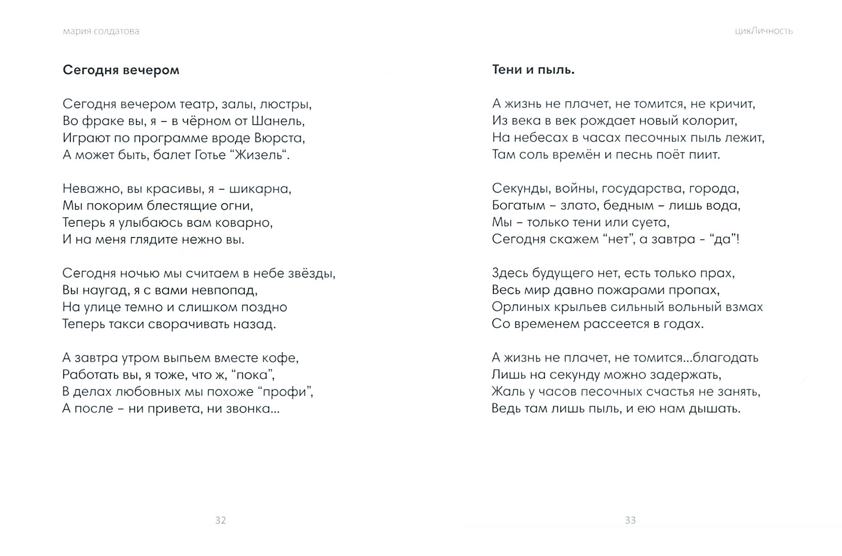 "цикЛичность" - вторая книга поэтессы Марии Солдатовой, наполненная пронзительной, понятной и близкой широкой публике любовной и философской лирикой. Книга - исповедь, в которой автор выворачивает свою душу наизнанку, заставляя читателя скинуть маску равнодушия и погрузиться в мир житейских тревог и волнений. Предыдущий сборник "Искры в темноте" увидел свет в ноябре 2016 года.