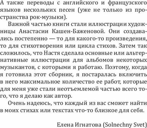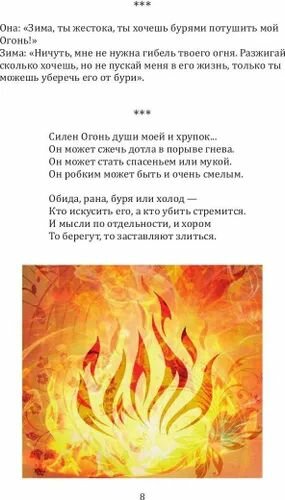"Хранительница огня" - сборник стихов и текстов Елены Игнатовой (Solnechny Svet). В книгу включены новые стихотворные циклы, стихи из изданных произведений, тексты, написанные автором для рок-групп "Гран-КуражЪ", "Алькасар", "Театр Теней", "SolReid", "Атом-76", "Hardy", музыканта Александра Юнкина. Отдельную главу составляют переводы текстов песен, сделанные автором с английского и французского языков. Основная идея сборника - показать, как важно хранить свой внутренний огонь и делиться им.