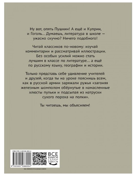 Благодаря красочным примечаниям знакомство с произведениями И.С. Тургенева, Л.Н. Толстого, А.П. Чехова и А.И. Куприна станет захватывающим погружением в историю и культуру, подарит самые неожиданные открытия и сделает школьную программу по-настоящему увлекательной.