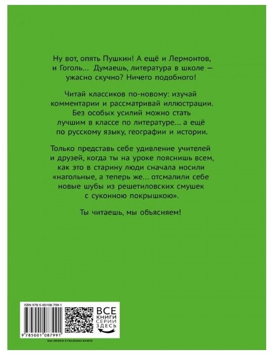 Благодаря красочным примечаниям знакомство с произведениями А.С. Пушкина, Л.Н. Толстого, И.С. Тургенева, А.П. Чехова, Н.В. Гоголя, станет захватывающим погружением в историю и культуру, подарит самые неожиданные открытия и сделает школьную программу по-настоящему увлекательной.