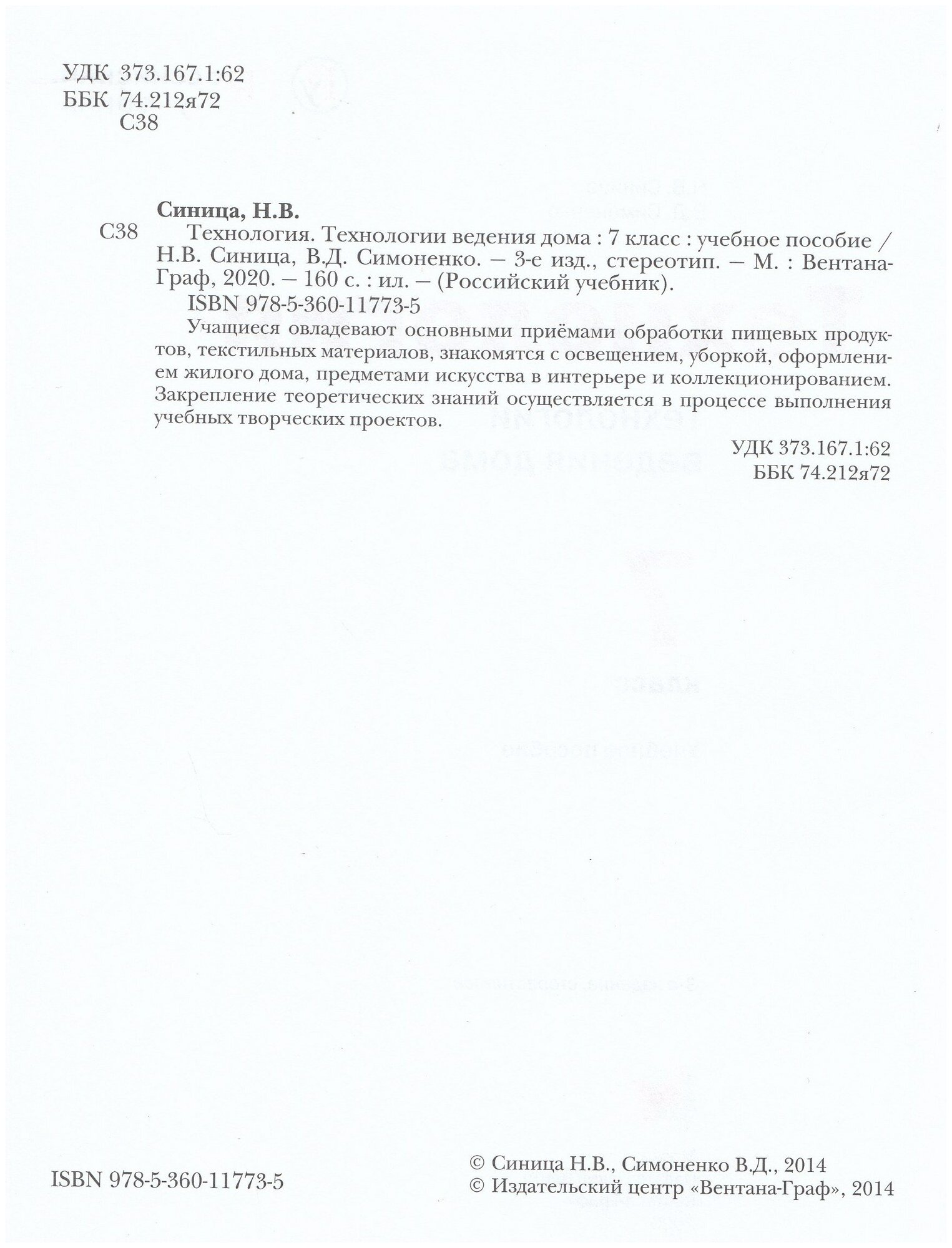 Технология Технологии ведения дома 7 класс (Симоненко Виктор Дмитриевич, Синица Наталья Владимировна); Вентана-Граф, 2020