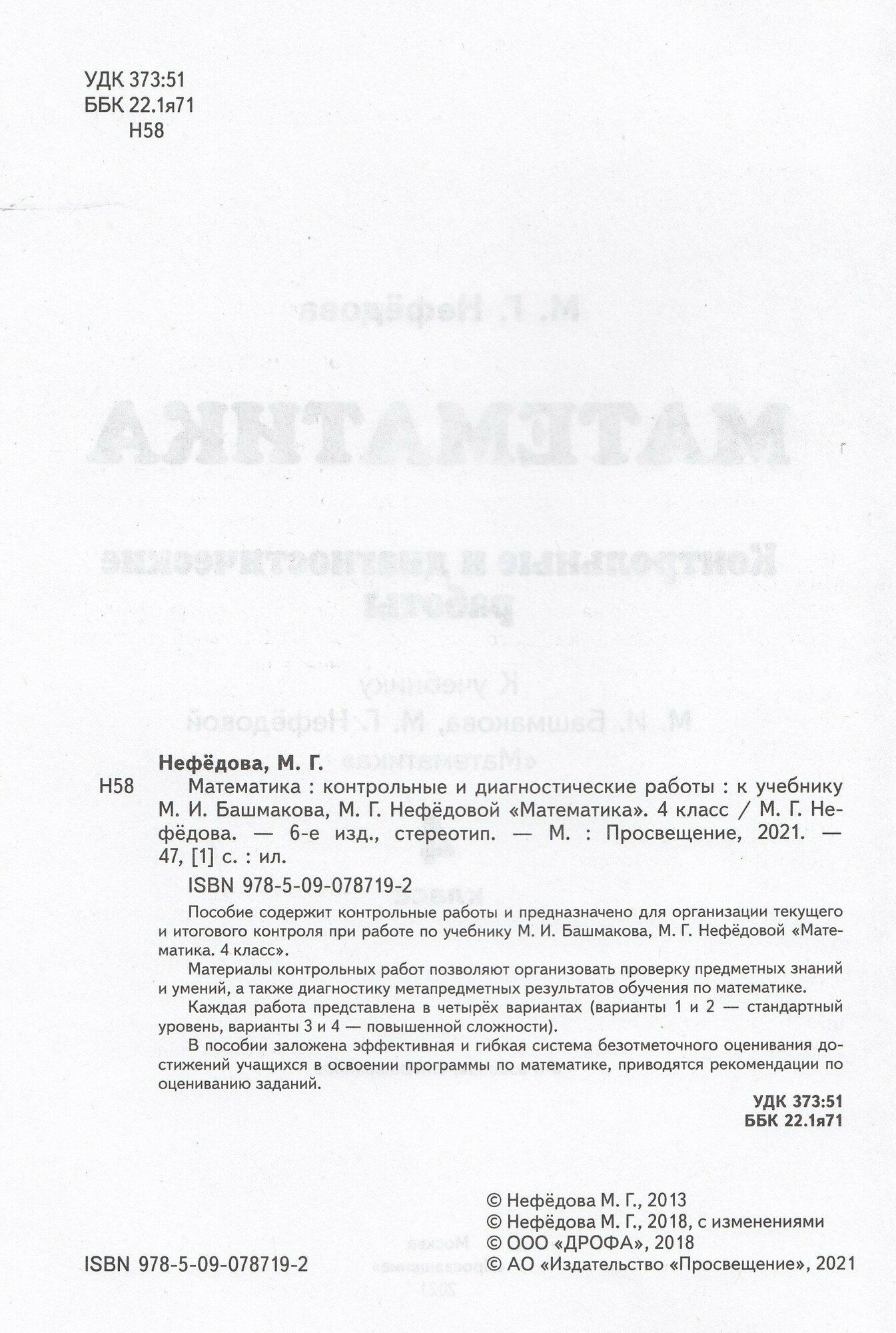 Математика 4 класс Контрольные и диагностические работы к учебнику М И Башмакова М Г Нефедовой Математика (Маргарита Геннадьевна Нефедова); Дрофа/Просвещение, 2023