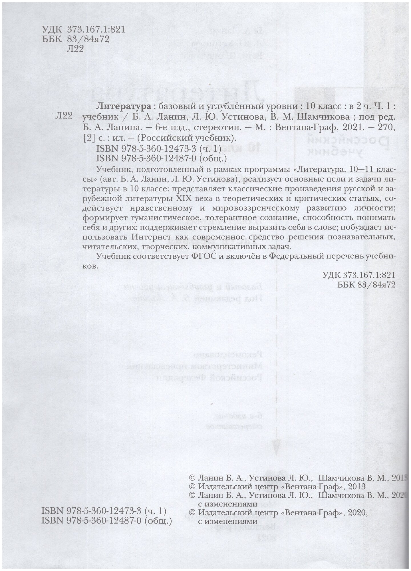 Литература 10 класс Учебник Базовый и углубленный уровни В двух частях Часть 1 (Ланин Борис Александрович, Шамчикова Валентина Максимовна, Устинова Людмила Юрьевна); ВЕНТАНА-ГРАФ, 2020