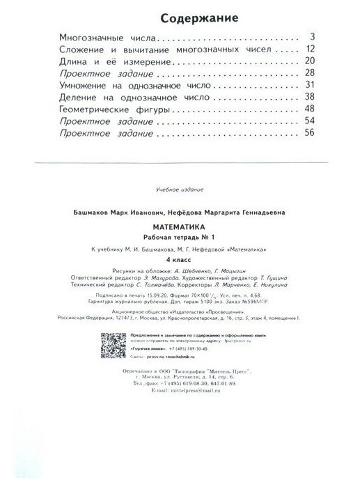 Рабочая тетрадь. ФГОС. Математика 4 класс, Часть 1. Башмаков М. И.Тетрадь предназначена для работы во 4 классе по учебнику «Математика» (авт. М. И. Башмаков, М. Г. Нефедова) в течение 1-го полугодия. Задания разбиты на блоки, соответствующие разделам и темам учебника. Тетрадь содержит задания на отработку навыка устных вычислений (в том числе с многозначными числами), формирование умения прогнозировать результат вычислений, моделировать задачи на движение. Проектные задания нацелены на формирование познавательной инициативы учащихся и универсальных учебных действий: моделирование реальной ситуации, планирование деятельности, распределение ролей при выполнении сложной работы, применение заданий в нестандартной ситуации.-Вес: 250 г.-Количество в упаковке: 1-Кол-во страниц: 62-Длина упаковки: 17-Высота упаковки: 2-Ширина упаковки: 24-Объем упаковки: 0.816-Объем продукта: 0.816-ISBN: 9785090787413-Набор: Нет-Школьный предмет: Математика-Школьный класс: 4-Количество страниц: 62-Год издания: 2021-Тип обложки: Мягкий переплёт-Автор: Нефедова Маргарита Геннадьевна, Башмаков Марк Иванович-Соответствие стандарту (ФГОС): Да-Возраст: Для детей