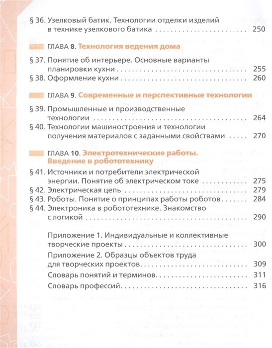 Учащиеся знакомятся с различными технологиями: промышленными, производственными, машиностроения и получения материалов с заданными свойствами; технологиями обработки конструкционных, текстильных материалов и пищевых продуктов. Получают сведения об электротехнических работах, роботах, использовании электроники в робототехнике. Методический аппарат учебника составляют вопросы для самопроверки, система заданий, включающих исследовательские, графические, практические задания, задания с использованием Интернета, а также темы проектов. Учебник содержит рубрику "Полезная информация", в которую помещён дополнительный материал, словари профессий и основных понятий и терминов. Учебник соответствует Федеральному государственному образовательному стандарту основного общего образования и включён в Федеральный перечень. Допущено Министерством просвещения Российской Федерации.