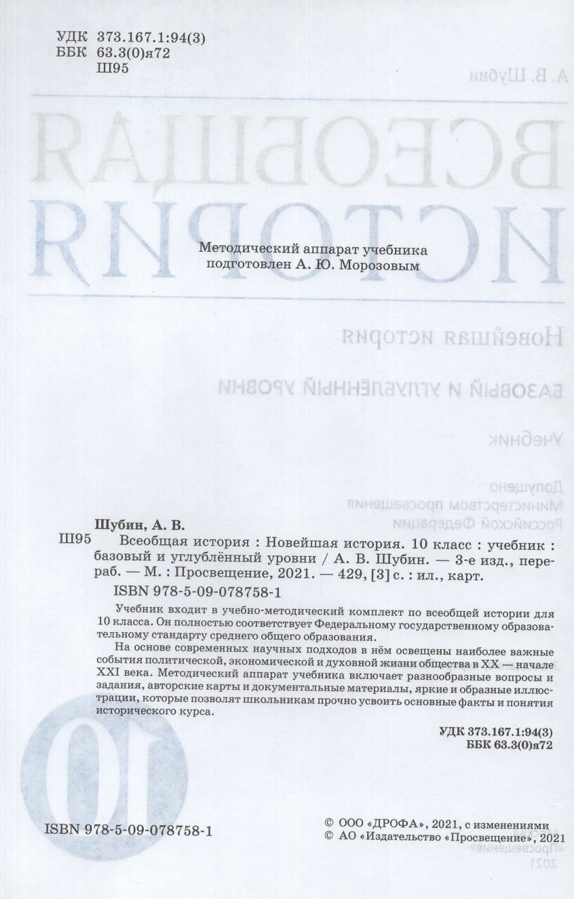Всеобщая история 10класс Новейшая история Базовый и углубленный уровни Учебник (Шубин Александр Владленович); Дрофа, 2021