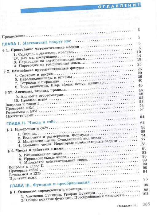 Особенностью учебника является отсутствие традиционного деления на алгебру и начала математического анализа и геометрию. Курс построен так, чтобы подчёркивать единство подходов и методов и не допускать «ликвидации» одного из предметов на длительный срок. Материал учебника разделён на три уровня: обязательный для всех учащихся, более сложный и наиболее трудный.