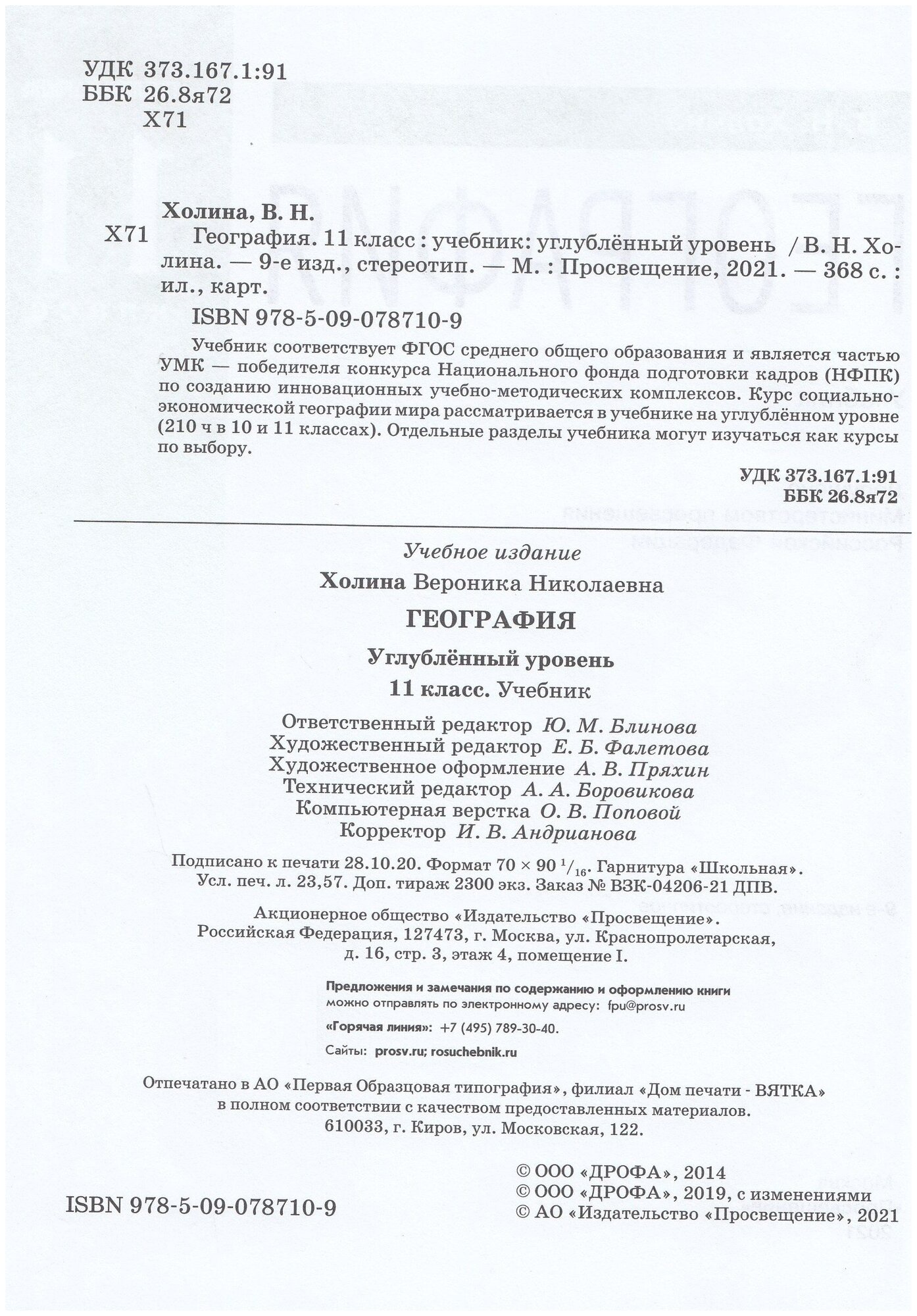 География 11 класс Учебник Углубленный уровень (Холина Вероника Николаевна); Дрофа, 2021