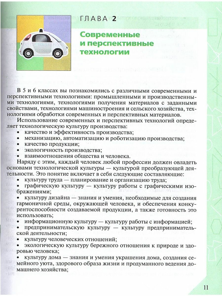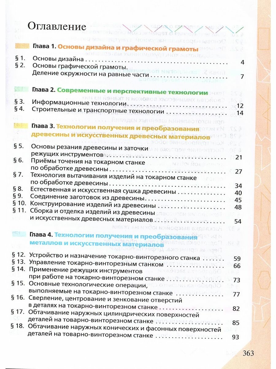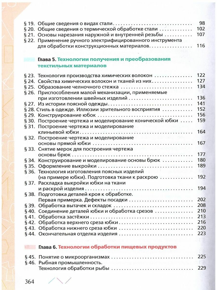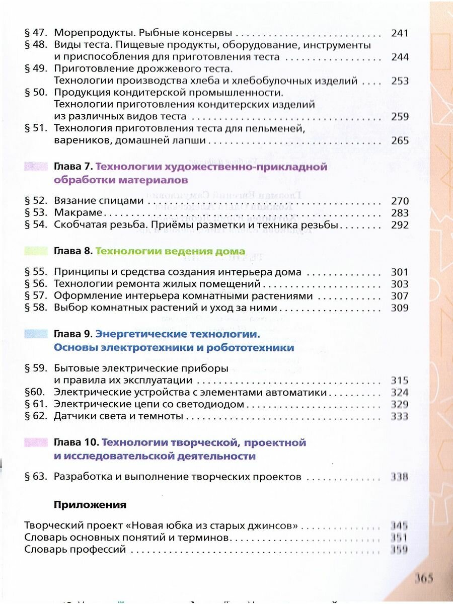 Учащиеся знакомятся с актуальными перспективными технологиями обработки материалов, сельскохозяйственными технологиями; технологиями обработки конструкционных, текстильных материалов, пищевых продуктов, художественно-прикладной обработки материалов. Получают сведения о технологии «умный дом», основам электротехники и робототехники. Методический аппарат учебника составляют вопросы для самопроверки, система заданий, включающих исследовательские, графические, практические задания, темы проектов, задания с использованием Интернета. Учебник содержит рубрику «Полезная информация», в которую помещён дополнительный материал, словари профессий и основных понятий и терминов.