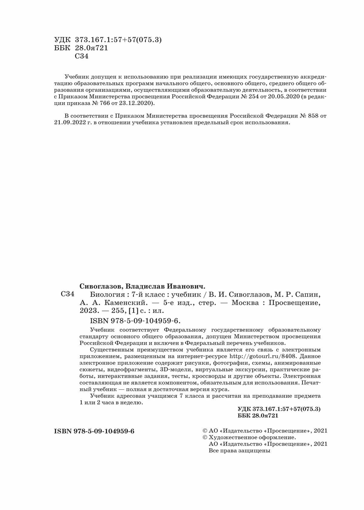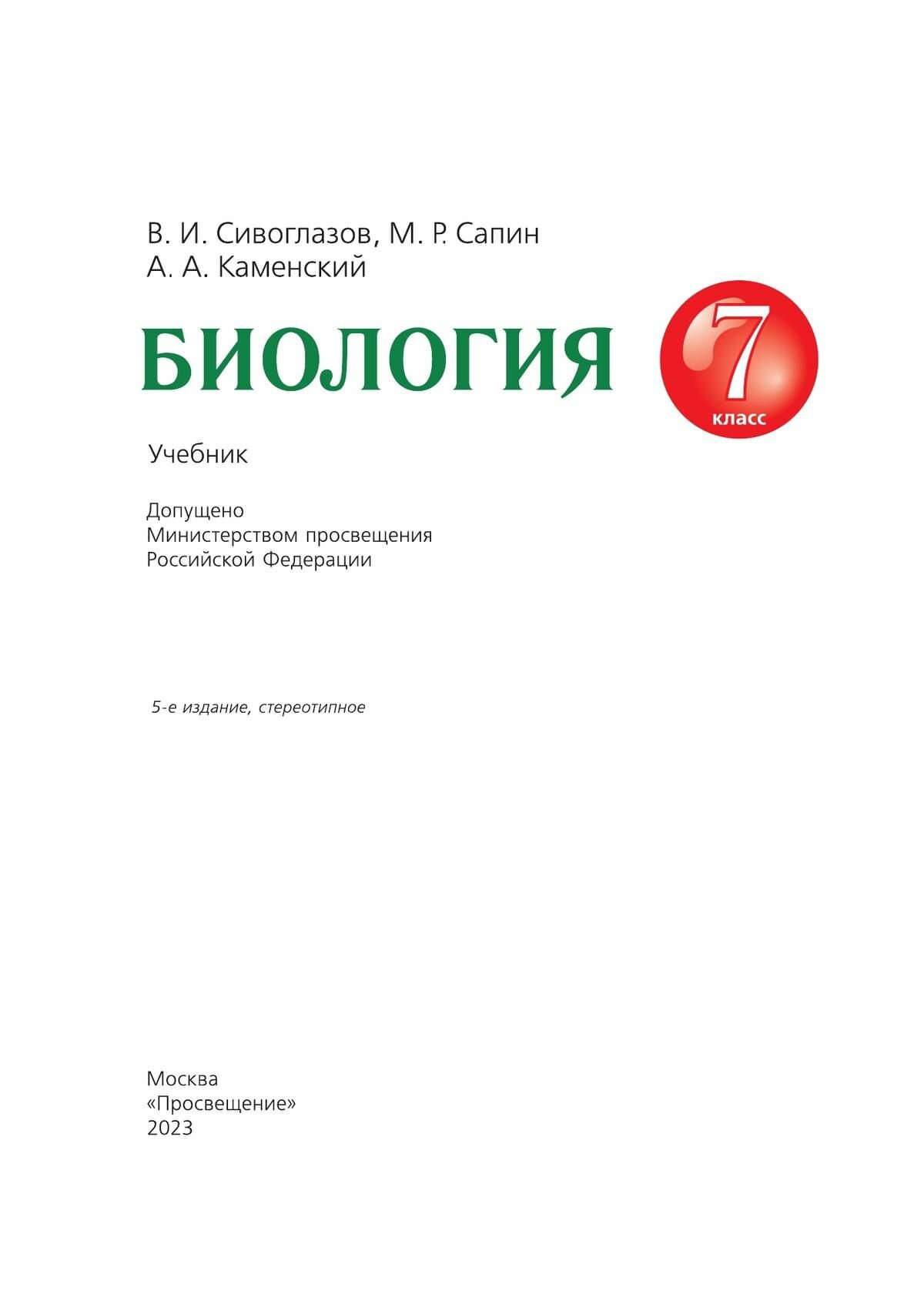 Книга: Биология 7 класс Учебник (Сивоглазов Владислав Иванович; Каменский Андрей Александрович; Сапин Михаил Романович); Просвещение Издательство, 2021