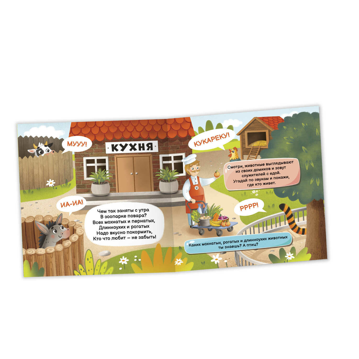 Весёлые герои расскажут малышу про свой обед в зоопарке. Под большими окошками, которые удобно открывать и закрывать, прячутся интересные задания. Забавные стихотворения помогут ребёнку больше узнать о диких животных: тюленях, енотах, фламинго, жирафах, слонах.