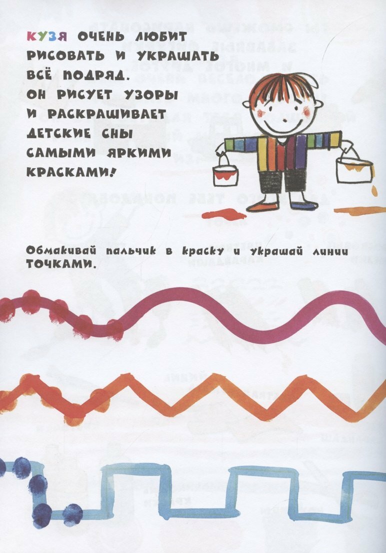 Кузя — весёлый фантазёр, который любит рисовать и придумывать разные истории. В этой книге Кузя предлагает маленьким читателям поиграть и порисовать красками, карандашами, фломастерами и мелками. А заодно научиться определять цвета, делать аппликации и просто фантазировать. Запасайтесь красками и присоединяйтесь к играм проказника Кузи!