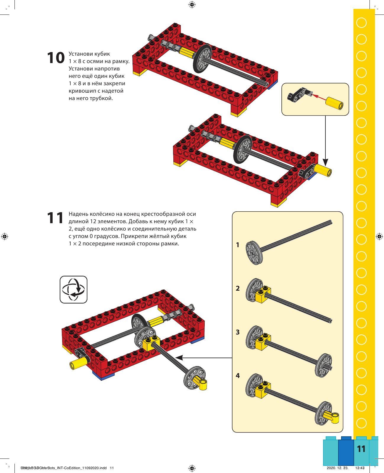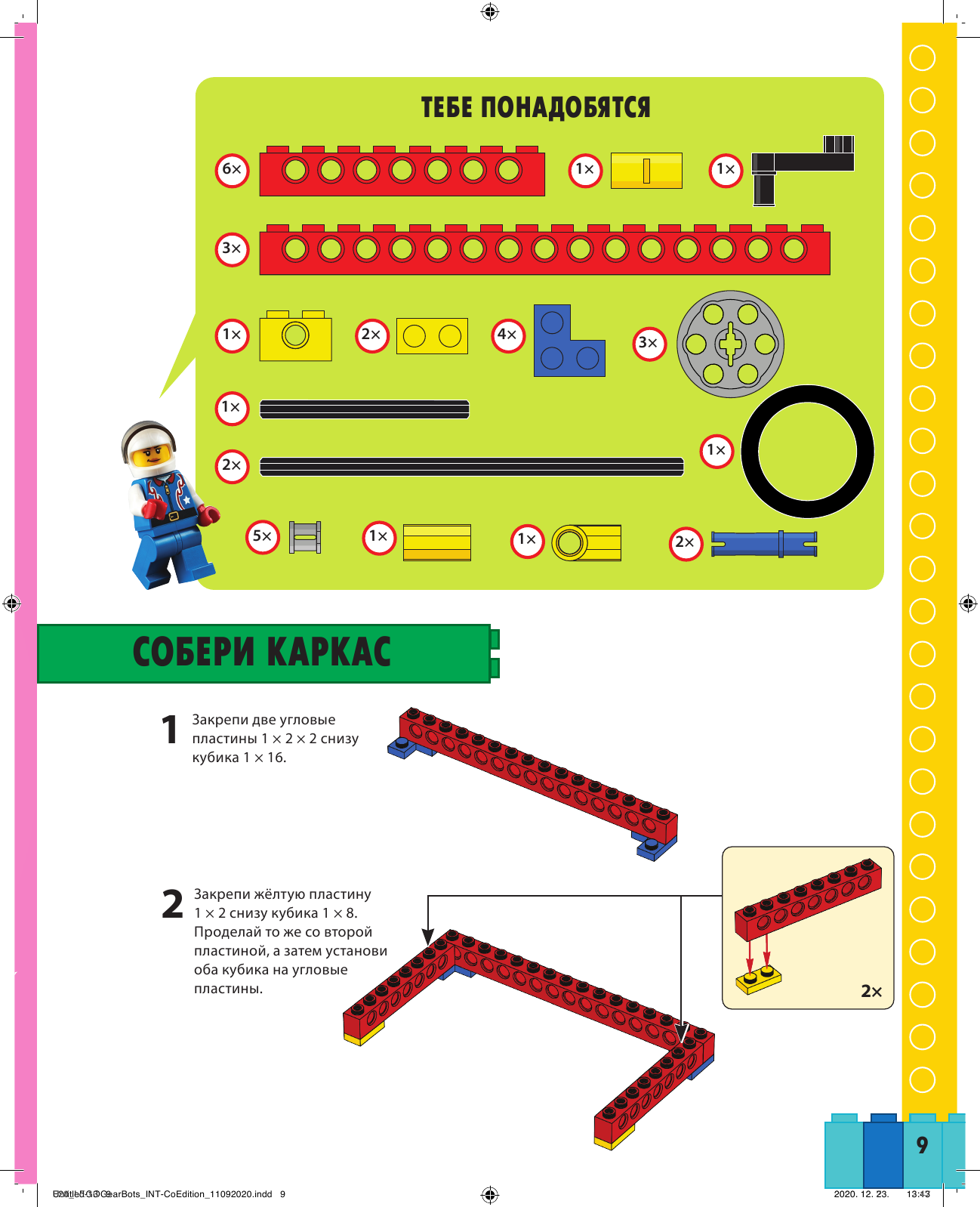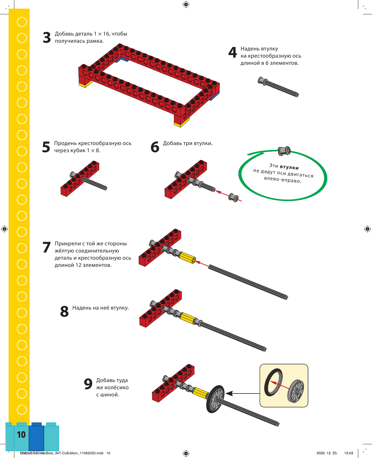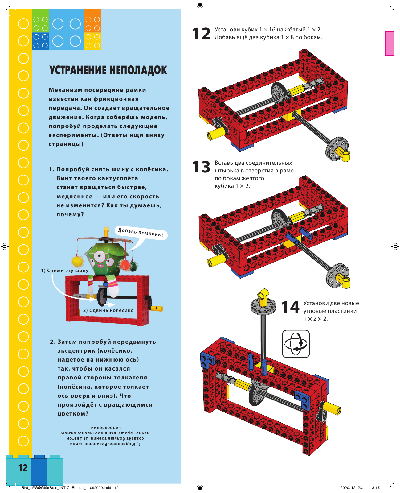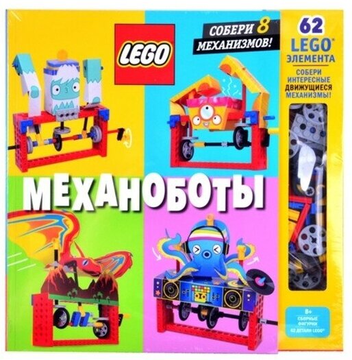 В набор входят: книга с подробными описаниями механизмов - для вдохновения и движения, 62 детали лего, 12 листов с бумажными деталями для механоботов.