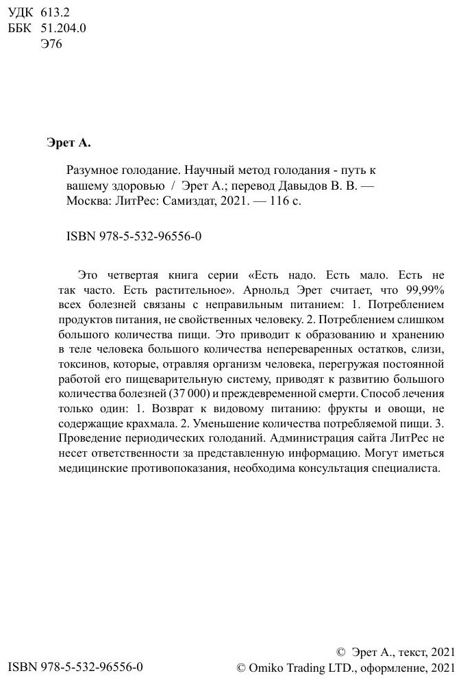 Разумное голодание. Научный метод голодания – путь к вашему здоровью (Арнольд Эрет); Автор, 2021