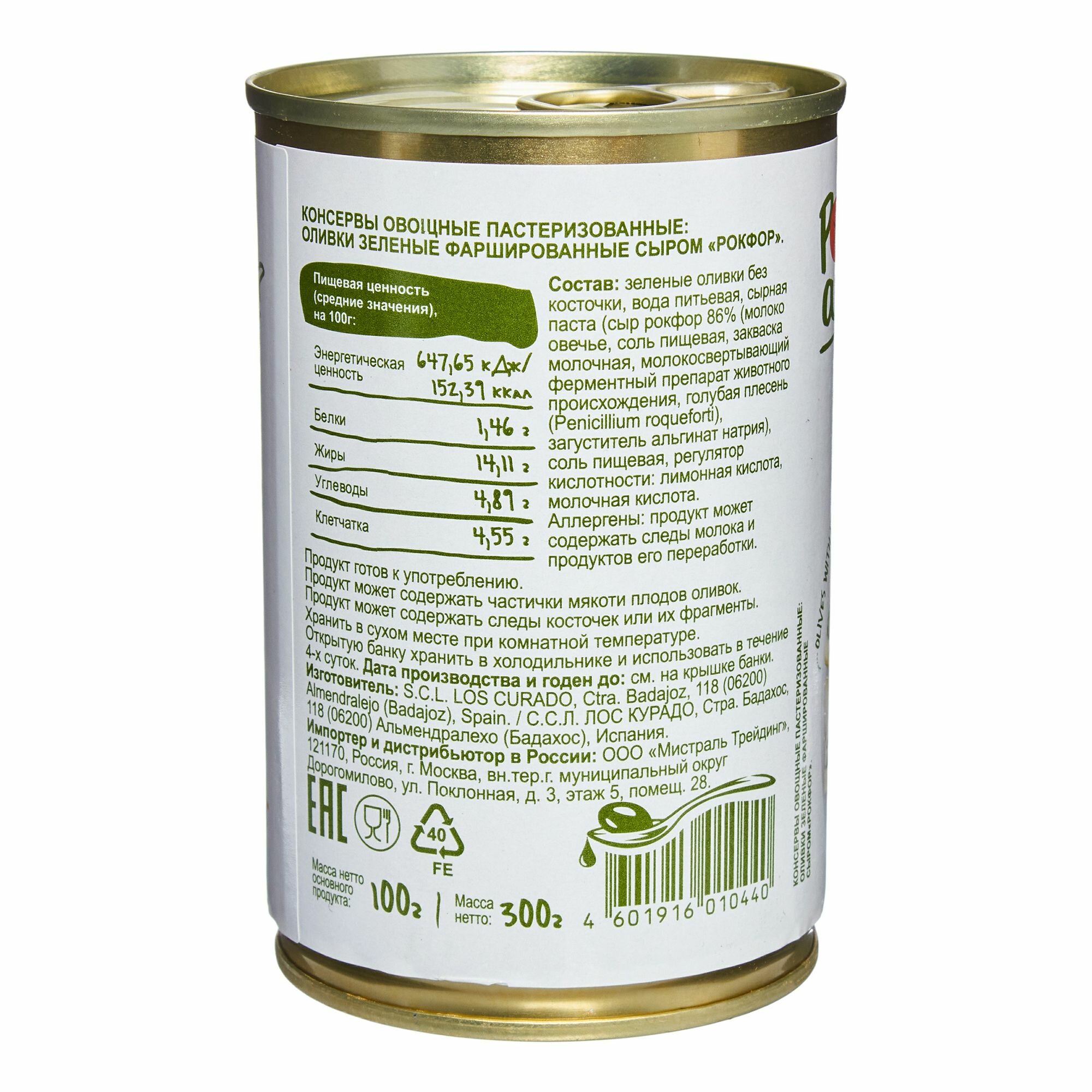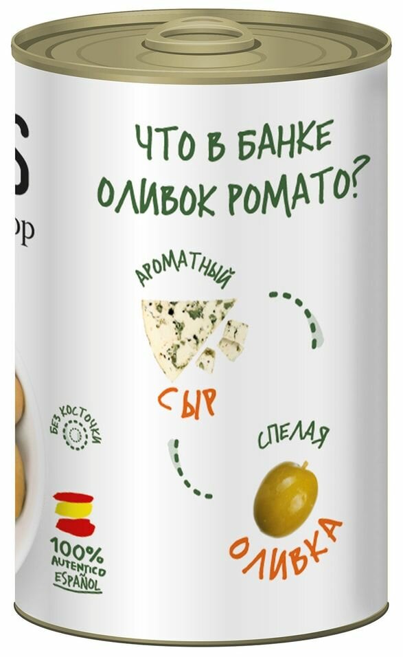 | Состав | Зеленые оливки без косточки, вода, сырная паста (сыр рокфор 86% (молоко овечье, соль пищевая, закваска молочная, молокосвертывающий ферментный препарат животного происхождения, голубая плесень (Penicillium roqueforti), загуститель альгинат натрия), соль пищевая, регулятор кислотности: лимонная кислота, молочная кислота. |