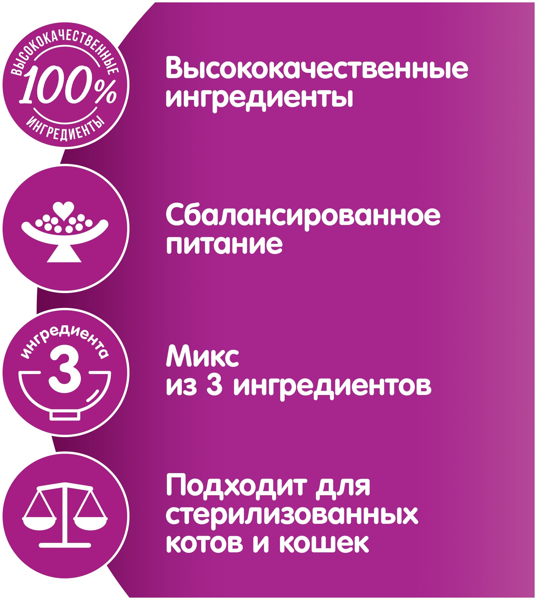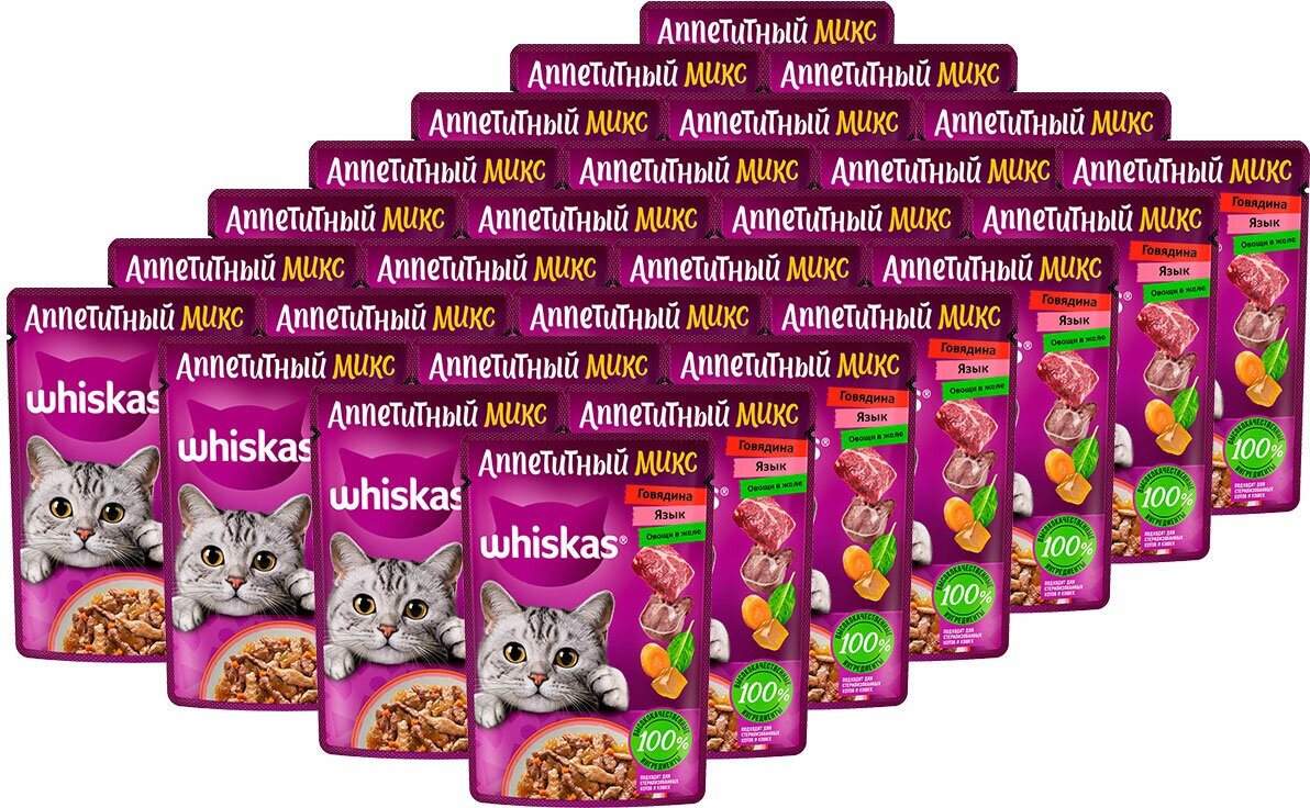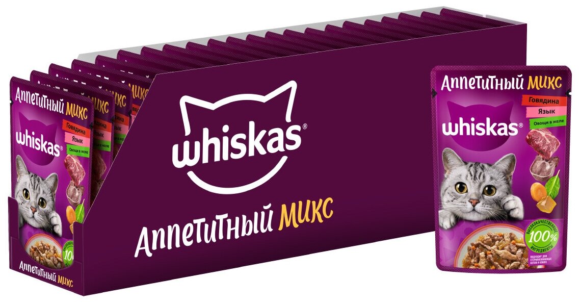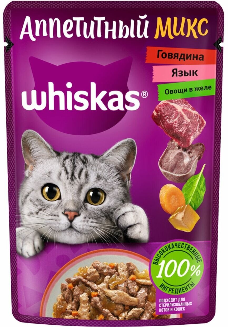 Говядина и язык с овощами сразу вс, о чм мечтала ваша кошка, в новой коллекции сбалансированных блюд WHISKAS Аппетитный микс для замурррчательной жизни. В каждом из паучей содержится три основных ингредиента: разные виды мяса или морепродуктов смешиваются в нежнейшем соусе или желе, чтобы вы воплощали мечты своих любимцев. Подходит для стерилизованных котов и кошек. WHISKAS для взрослых кошек это: Оптимальный баланс питательных веществ для полноценной жизни. 100% сбалансированный рацион Вс необходимое для поддержания здоровья: Омега-6, кальций, фосфор и таурин, витамин Е, цинк. Вкусное питание с высоким содержанием белка на каждый день. 100% натуральные высококачественные ингредиенты: мясо и субпродукты без добавления ароматизаторов и консервантов. Ваша кошка будет мурчать от удовольствия!Состав: мясо и субпродукты (в том числе говядина и свиной язык), продукты животного происхождения, пшеничная мука, овощи (морковь и шпинат), загустители, аминокислоты (в том числе таурин), минеральные вещества, витамины, сахара, краситель. Содержание питательных веществ (100г): белок - 8 г; жир - 3,5 г; зола - 2 г; клетчатка - 0,2 г; влага - 84 г; витамин А - не менее 150 МЕ; витамин E - не менее 1 мг. Энергетическая ценность (100г): 70 ккал / 293 кДж.