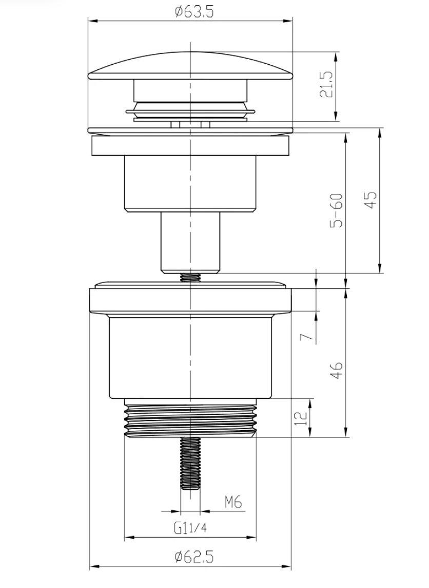 Универсальный донный клапан Lemark Click-clack для слива диаметром 32 мм имеет круглую крышку размером 63.5 мм и изготовлен из латуни. Универсальность данного клапана означает использование как в раковинах с переливом, так и без него. В устройстве выпуска других донных клапанов имеется специальное отверстие для перелива. Универсальный же клапан состоит из двух частей с возможностью регулировки высоты под высоту слива раковины. Расстояние между верхней и нижней частью регулируется от 5 до 60 мм, что и позволяет сопоставить клапан с выходом перелива раковины. Механизм Click-clack (Клик-клак) назван созвучно своему действию – при нажатии на крышку клапан закрывается, при повторном нажатии – открывается.