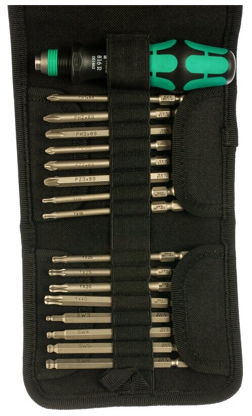 Складная сумка с битами длиной 89 мм с шариковым наконечником, который позволяет отклонять или поворачивать ось инструмента. Набор включает ручку-держатель 816 R Kraftform с быстрозажимным патроном Rapidaptor и многокомпонентной ручкой Kraftform для малоутомительной работы.