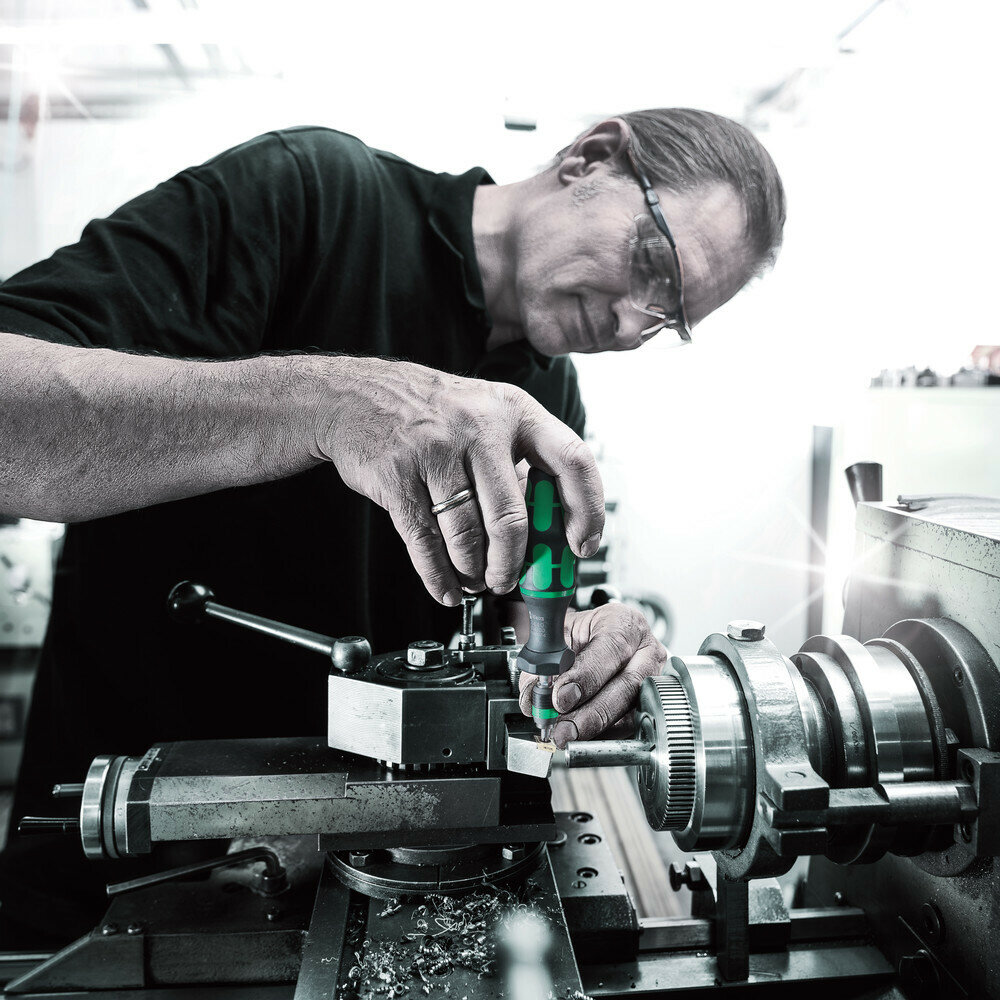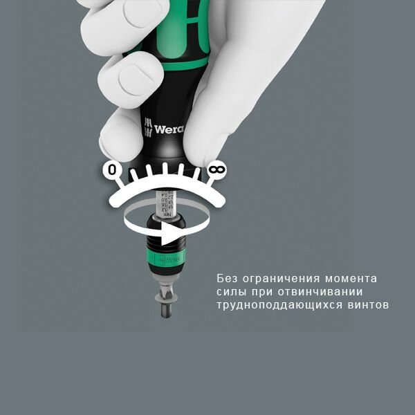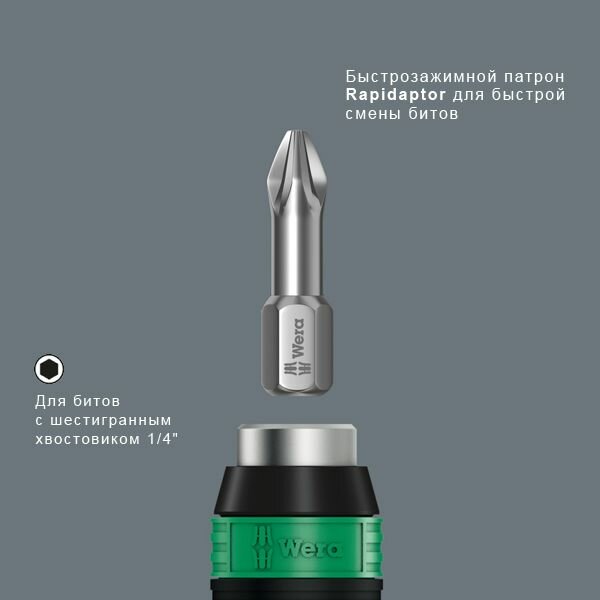 Динамометрическая отвёртка Kraftform с установкой момента затяжки, с быстрозажимным патроном Rapidaptor. С сигналом-щелчком. Без ограничения момента силы при отвинчивании трудноподдающихся винтов. Многокомпонентная ручка Kraftform. Подходит для бит 1/4". Крутящий момент 0.3 - 1.2 Нм.