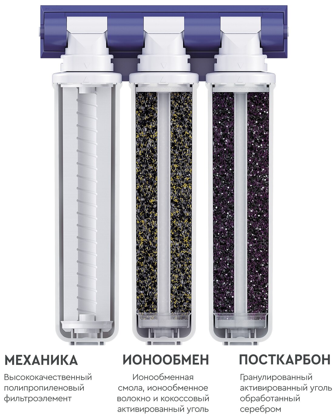 Комплексная очистка водопроводной воды от всех основных содержащихся в ней вредных примесей. Быстрая замена картриджей без специальных инструментов.