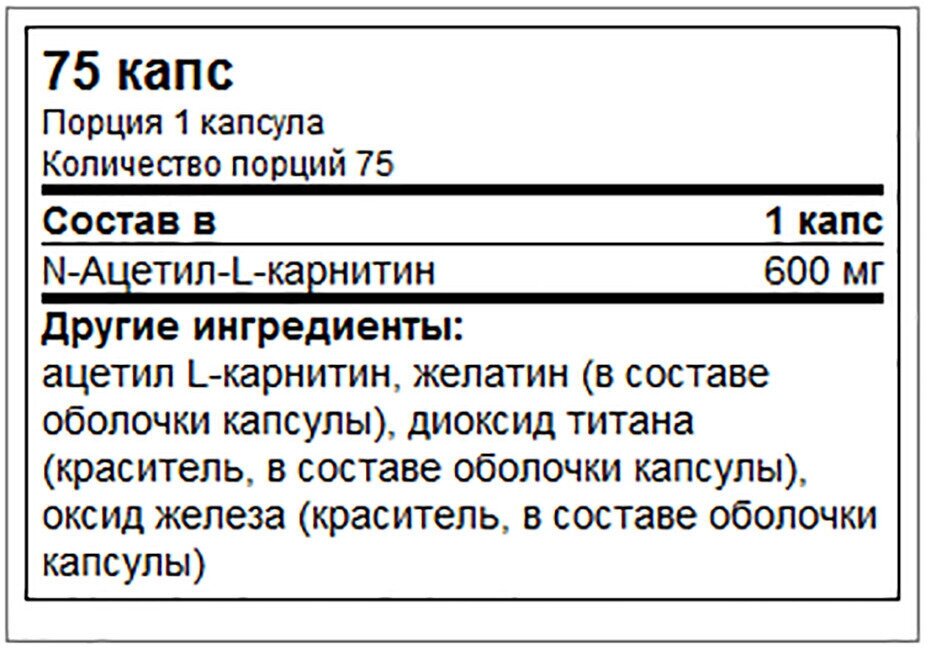 N-Acetyl-L-Carnitine — это карнитин в самой эффективной форме!Продукт представляет собой натуральный Л-карнитин в ацетилированной форме, позволяющей организму сразу использовать его для сжиганияя жира, минуя стадию ацетилирования.Преимущества:Продукт поставляется в виде твердых желатиновых капсул, которые позволяют доставлять активное вещество к месту его максимально эффективного усвоения в неизменном видеБлагодаря наличию ацетильной группы в N-Acetyl-L-Carnitine, он сжигает жир без дополнительных количеств дорогостоящего коэнзима Ку-10, который требуется при использовании обычного Л-карнитинаПри использовании N-Acetyl-L-Carnitine организму требуется значительно меньшее количество кислорода для того, чтобы начать использовать жировую ткань в качестве источника энергии. Следовательно, при использовании N-Acetyl-L-Carnitine можно значительно сократить аэробные нагрузки или увеличить их эффективность при сохранении длительностиПо некоторым данным ацетил карнитин может действовать, метаболизируя жиры даже при отсутствии аэробных нагрузок. Поэтому его, в отличии от обычного Л-карнитина, есть смысл употреблять как при наличии аэробных нагрузок, так и при их отсутствии