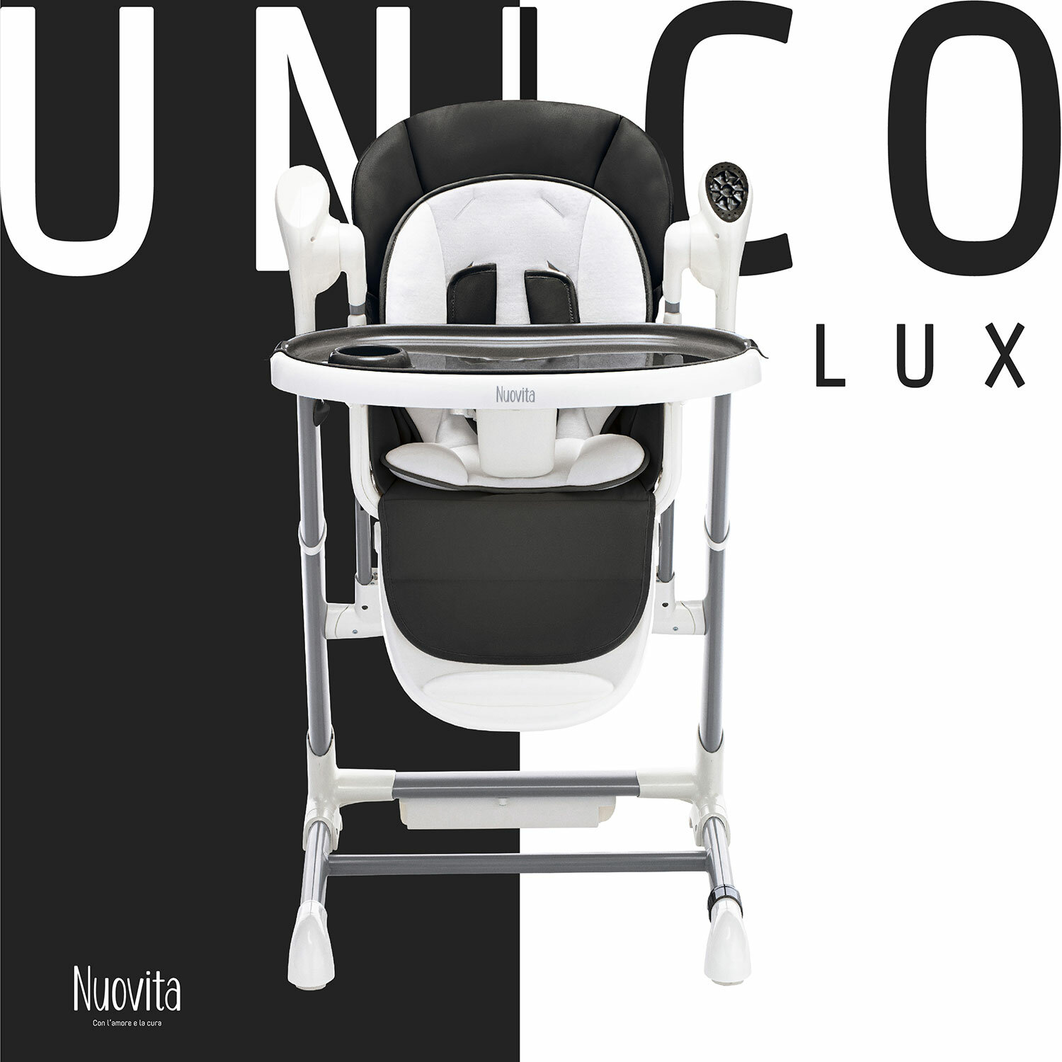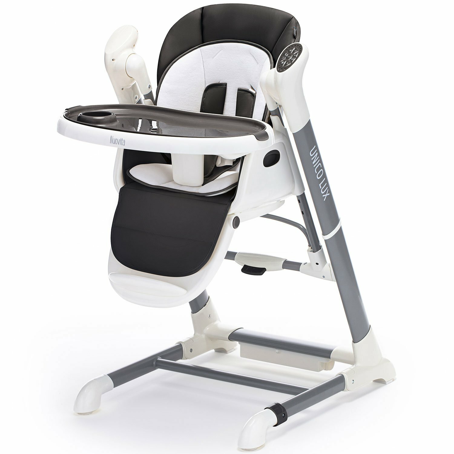 Unico lux от бренда Nuovita — это стульчик для кормления 2в1, который можно использовать как шезлонг и качели для грудничка. Он пригодится с самого рождения: шезлонг расположен высоко от пола, сиденье раскладывается в полулежачем положении, электронный механизм укачивает ребенка и проигрывает музыкальные композиции. Когда малыш подрастет, детский стульчик для кормления позволит усадить его за один стол со взрослыми или отдельно, чтобы он мог кушать на специальном столике, рисовать или играть.